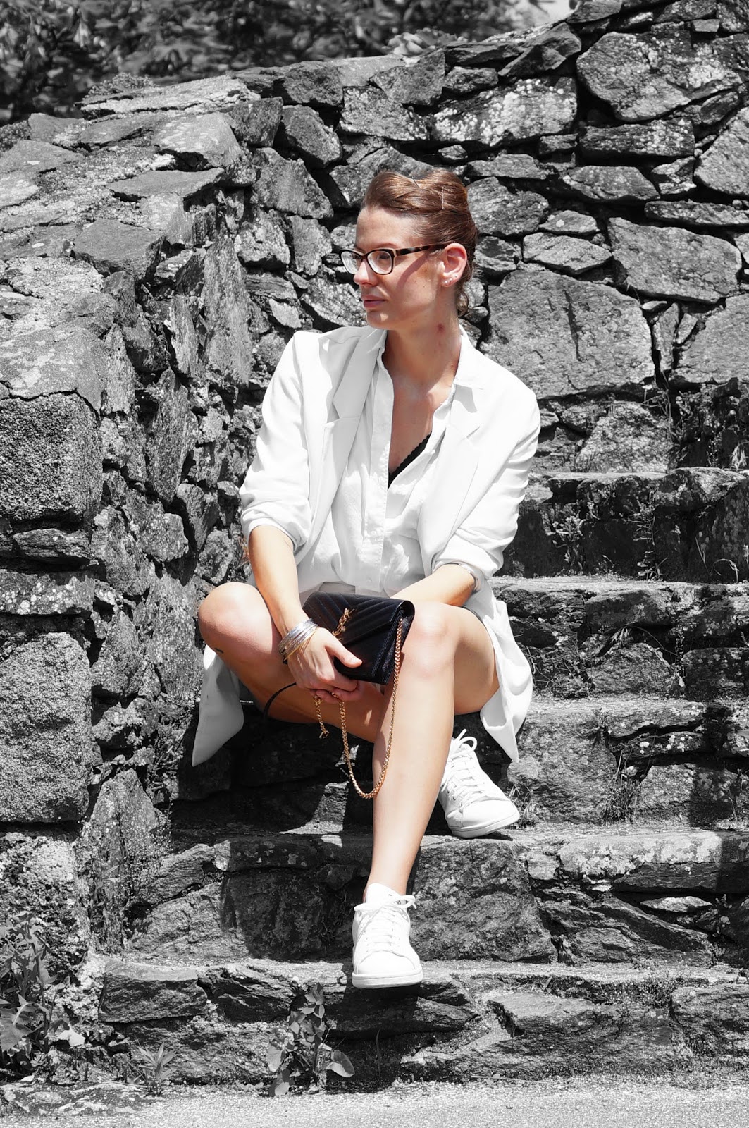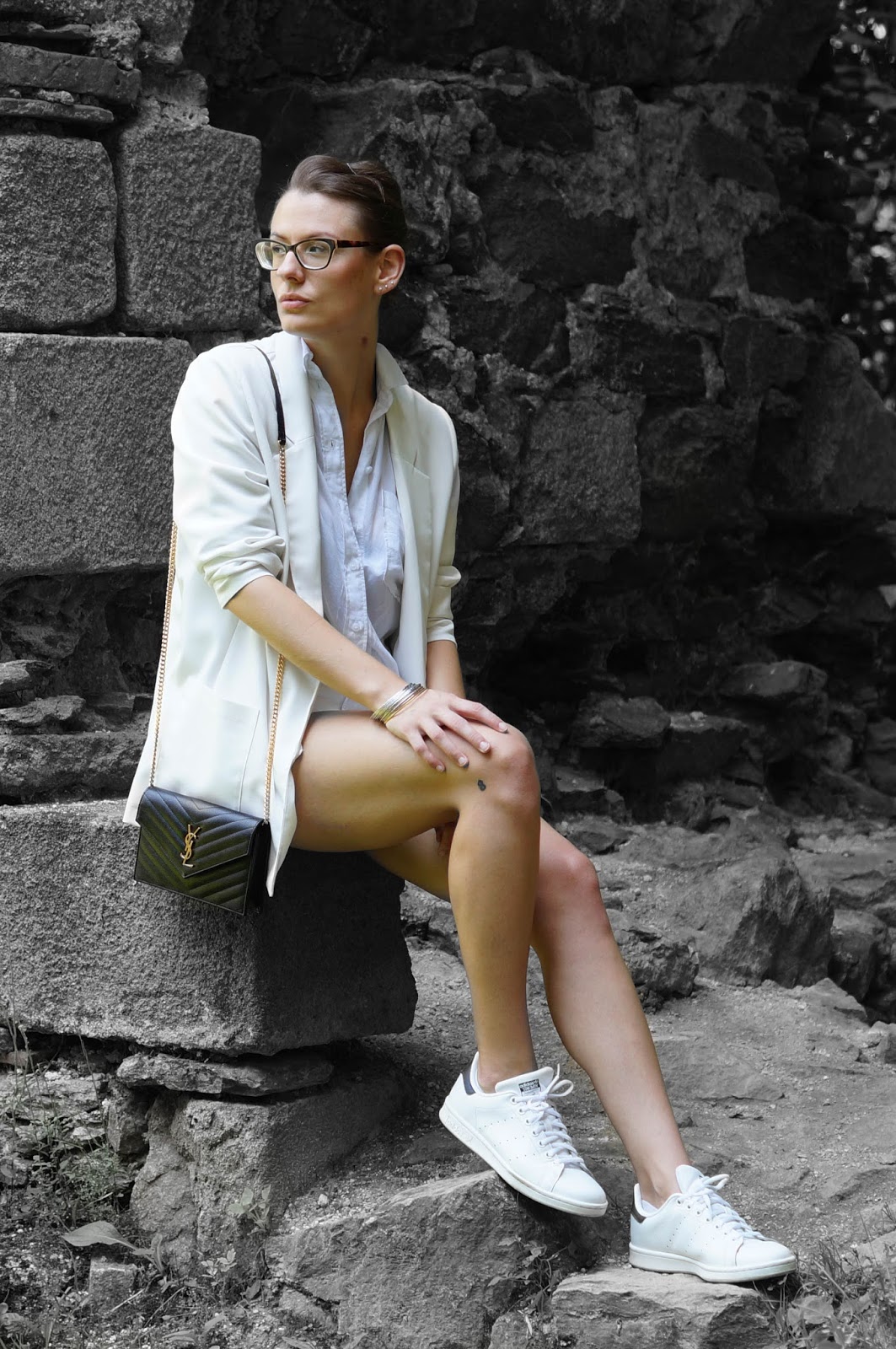 WEARING – blazer: h&m // blouse: h&m // white denim shorts: bikbok // lace bra: h&m // sneakers: adidas stan smith // watch: cluse // bangles: jukserei & h&m // bag: saint laurent