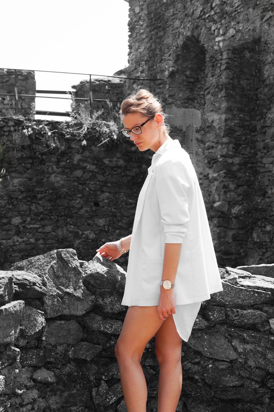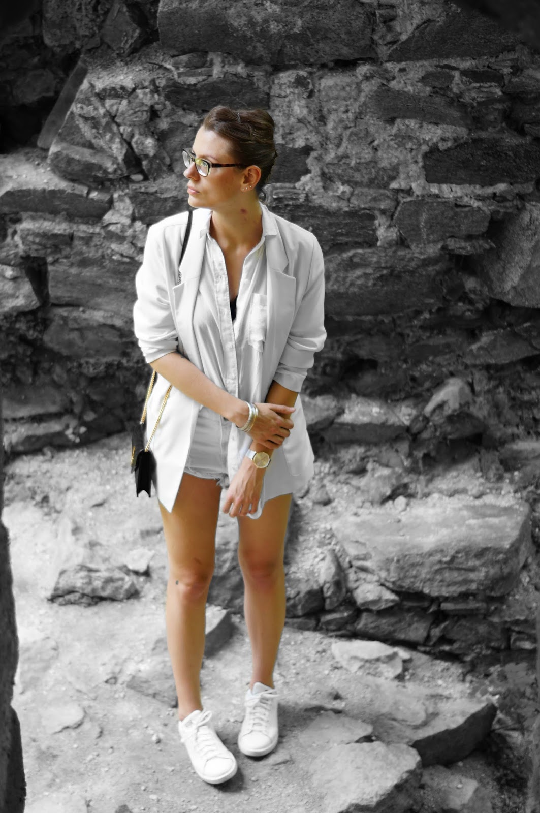 Die vergangene Woche war in Österreich endlich mal so richtig sommerlich (über 30 Grad), daher haben der Herr und ich die letzten Tage so viel Zeit wie möglich draußen verbracht … Wir unternehmen an Wochenenden fast immer Ausflüge (meist nach Wien oder Salzburg), da am Samstag aber schon bald Gewitter gemeldet waren, wollten wir uns nicht zu weit von zuhause wegbewegen (ich muss an dieser Stelle zugeben, ich hasse Regen, sobald es regnet gehe ich freiwillig nicht mehr vor die Türe …). Schließlich hat es uns zu einer wunderschönen Burgruine im Umland von Linz verschlagen, die man völlig frei erkunden kann und die wir sogleich als Shooting Location für ein neues Outfit genutzt haben. Hier darf ich euch also den ersten all white Sommerlook dieses Jahres auf meinem Blog präsentieren. So sehr ich all black im Winter auch liebe, im Sommer darf es dann auch gerne all white sein! Also hab ich ganz einfach weiße Denim Shorts, ein weißes Hemd und einen weißen Blazer mit meinen Stannies kombiniert, dazu meine neue Gold-silberne Uhr von Cluse, passende Armreifen und meine Saint Laurent Tasche.