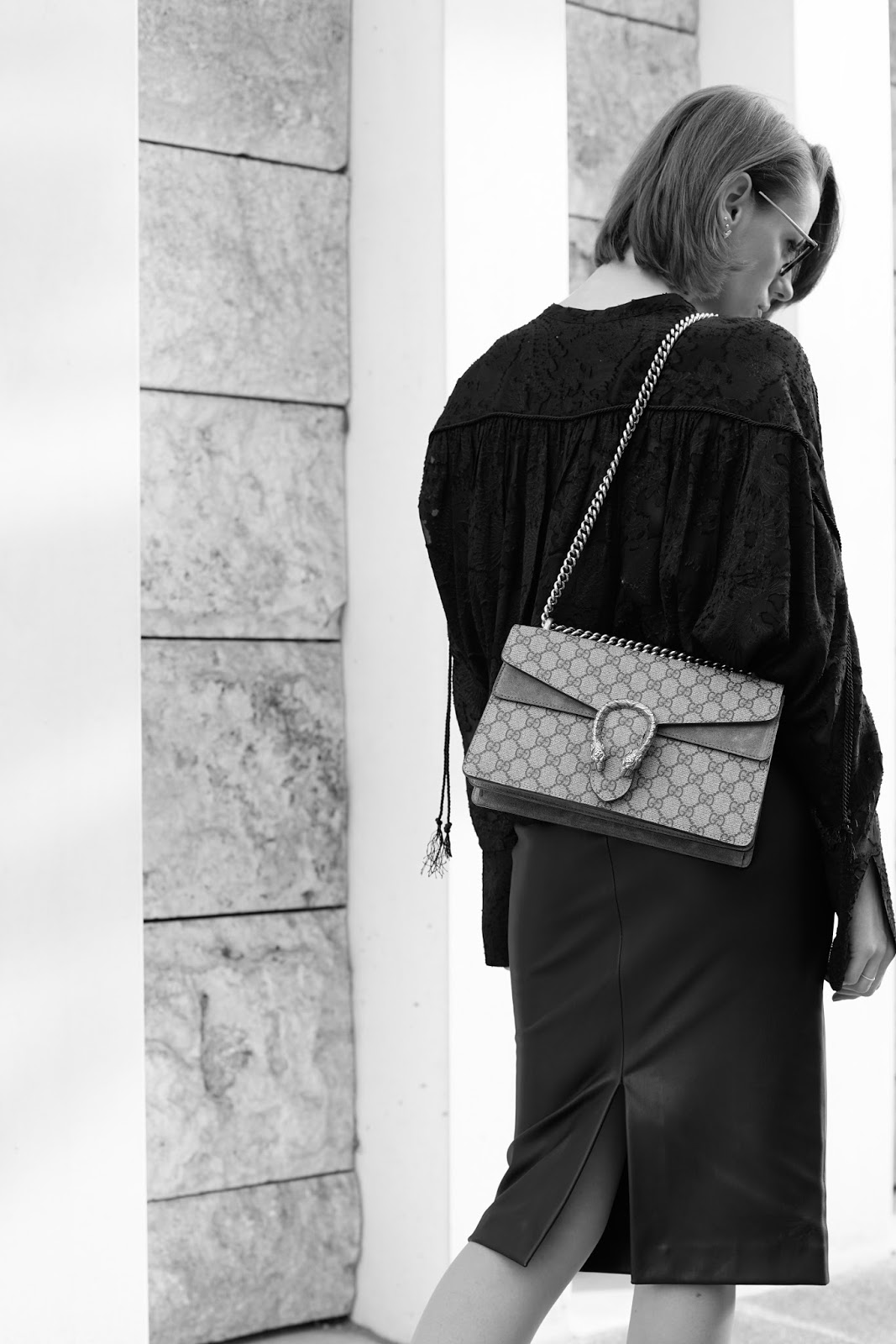 I’m not sure when I bought my H&M Studio Collection AW16 blouse last year exactly, but it was already to chilly to wear it. When I reorganized my capsule wardrobe in order to write a blogpost about it (if you’re interested, you can read it here) I rediscovered it. I have to confess I immediately fell for the black lace fabric, the cord details and the wide batwing sleeves again. Thanks to its loose cut the blouse really is perfect for an allblack summer situation. I wear a H&M STUDIO COLLECTION AW16 blouse, a leather skirt and granny heels from ZARA and my GUCCI Dionysus.