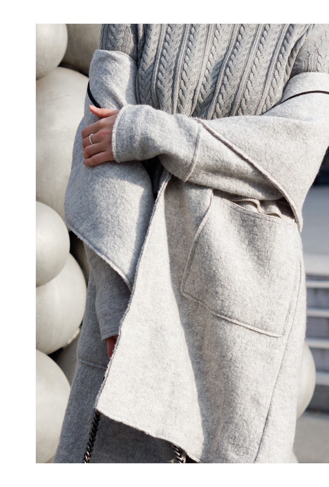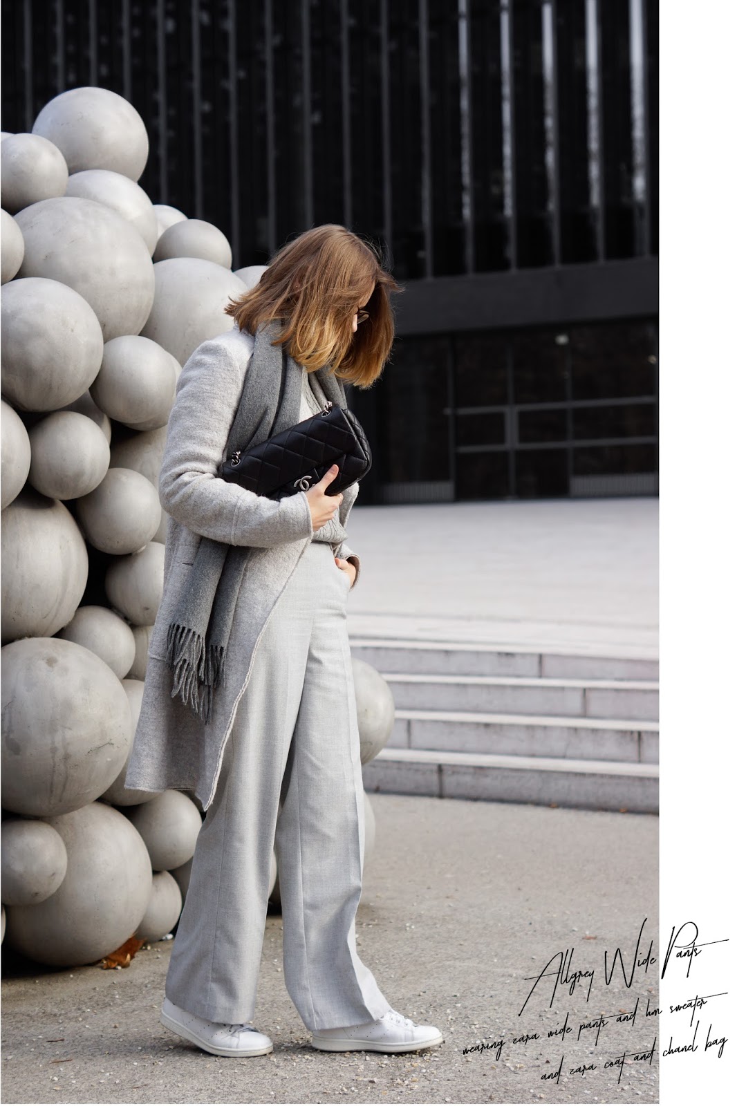 So, nun aber zum heutigen Allgrey Wide Pants Look: Nachdem mir Wide Pants schon letztes Frühjahr äußerst positiv aufgefallen waren, habe ich tatsächlich niemals ein für mich wirklich passendes Modell gefunden. Entweder waren die Hosen zu lang, zu weit oder hatten die falsche Farbe … Nachdem ich die Suche bereits lange aufgegeben hatte, bin ich im Zara Sale unverhofft über ein Paar hellgrauer Wide Pants gestolpert. Glücklicherweise in einen etwas dickeren Stoff, sodass sich das gute Stück auch super im Winter tragen lässt … Kombiniert habe ich einen Allgrey Wide Pants Winter Look mit Pulli und einem warmen Wollmantel. Übrigens trage ich dazu nach ewig langen Zeiten mal wieder meine Stannies. Nachdem es im Frühjahr kaum ein Outfit ohne meine liebsten Sneakers gab, sind sie den Sommer und Herbst über tatsächlich eher im Schuhschrank verstaubt … Dabei wären sie doch so gemütlich! Zu den ZARA Wide Pants trage ich einen Pulli von H&M, Wollmantel von ZARA, Stan Smith Sneakers von ADIDAS und meine CHANEL.