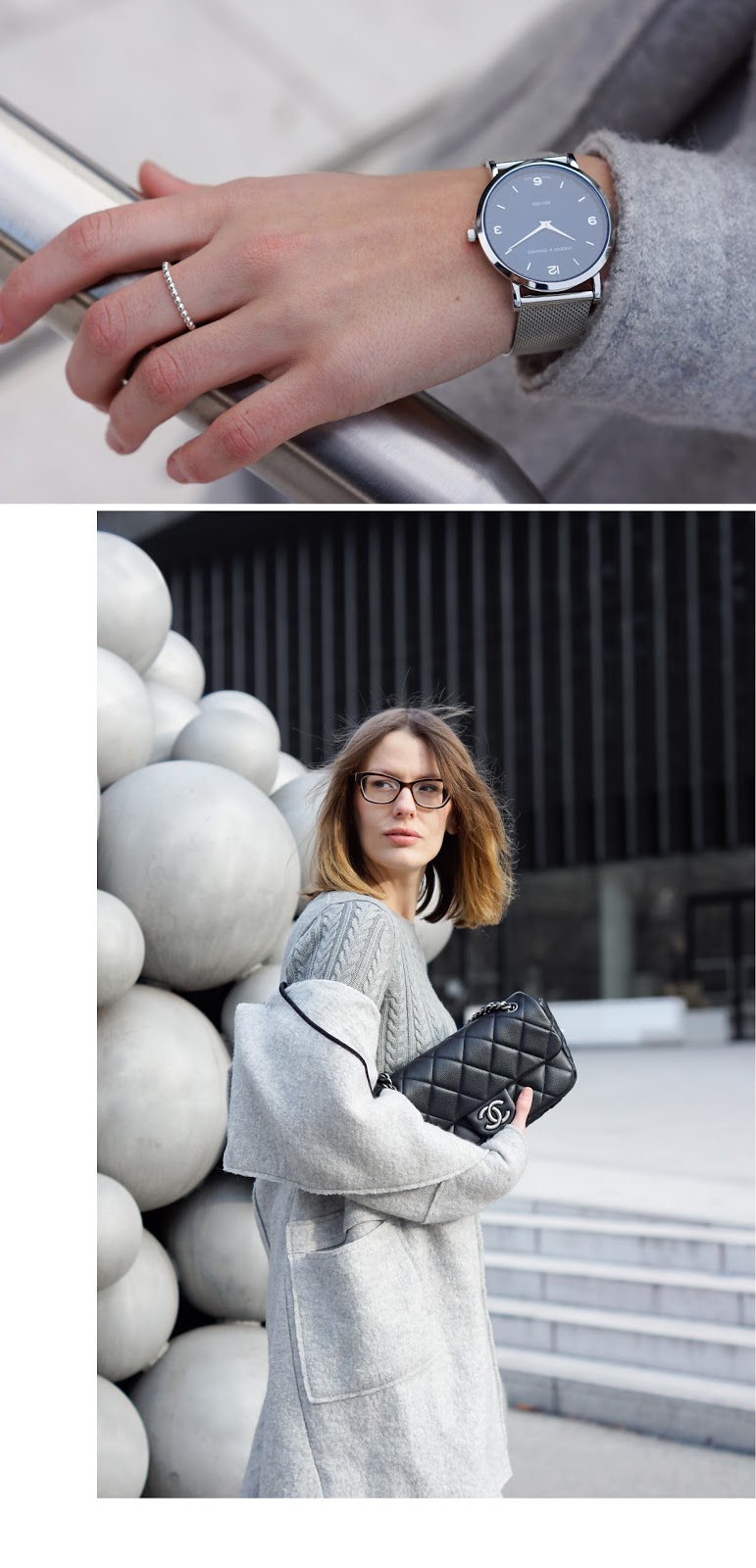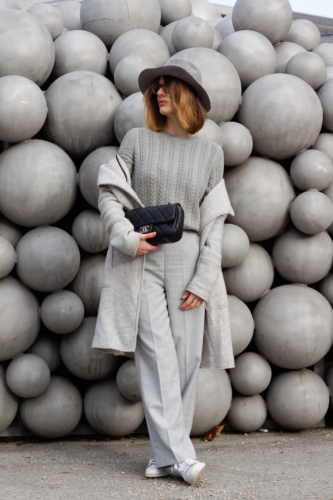But now it’s all about today’s outfit: I really liked wide pants right away when I first saw them in various spring collections, but somehow never really found a fitting model for me. Most of the time they were too long, woo wide or in the wrong colour … After having ended my search for a long time, I unexpectedly found a pair of grey wide pants in Zara sale. Luckily enough in a nice and warm fabric so I can easily wear them in winter, e.g. in a cozy allgrey wide pants outfit with knit and coat. I wear ZARA wide pants and coat, H&M knit, Stan Smith Sneakers from ADIDAS and my CHANEL.
