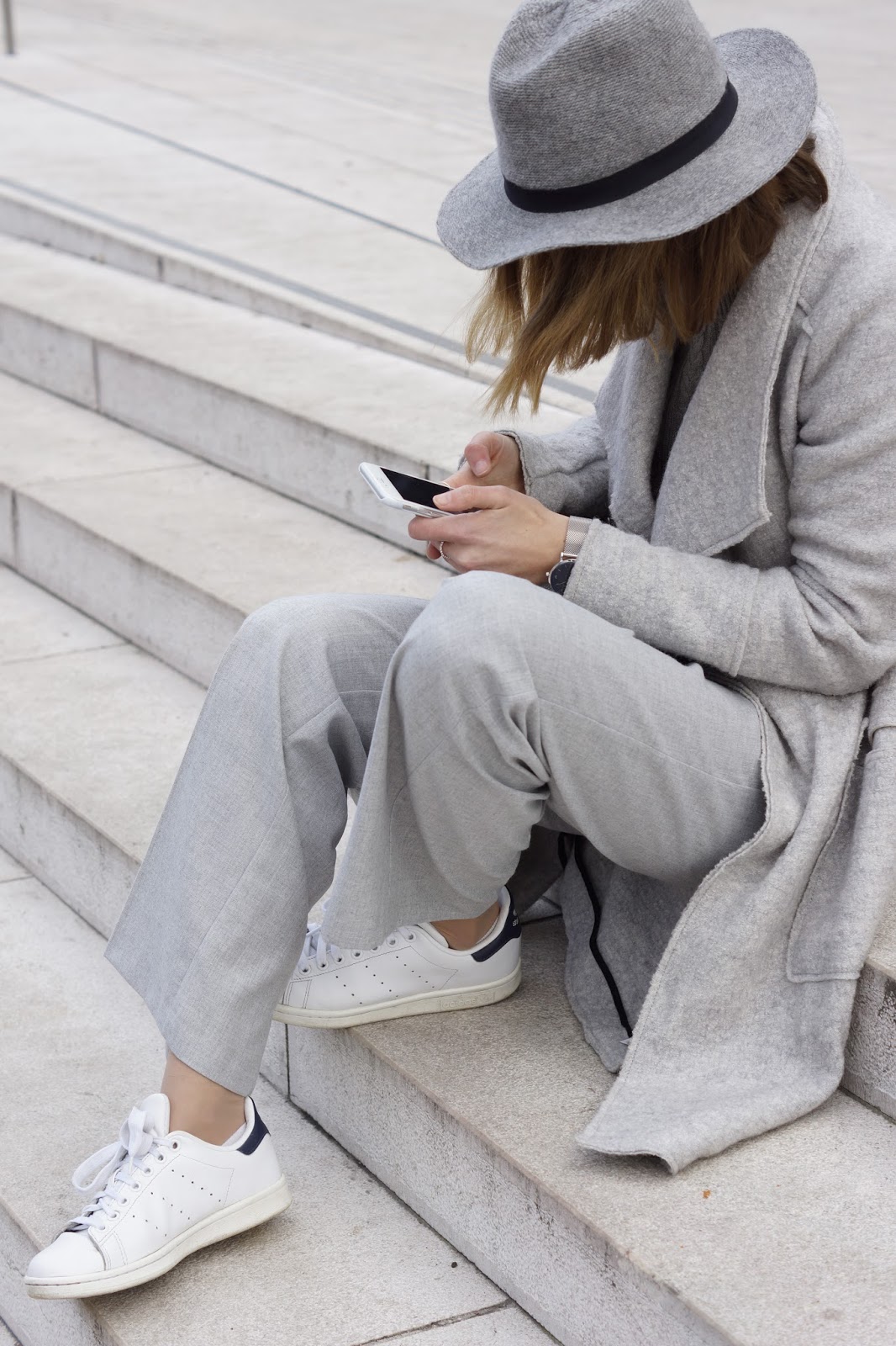 So ein stimmiger und harmonischer Look <3 All Grey geht sowieso immer und liebe ich sehr! Und die Kombi mit dem Hut und deinen Stan Smiths ist mehr als gelungen! Die Hose steht dir übrigens super und generell wieder so schöne Fotos 🙂 also ein Lob an Pezi und natürlich an das fotogene Modell <3