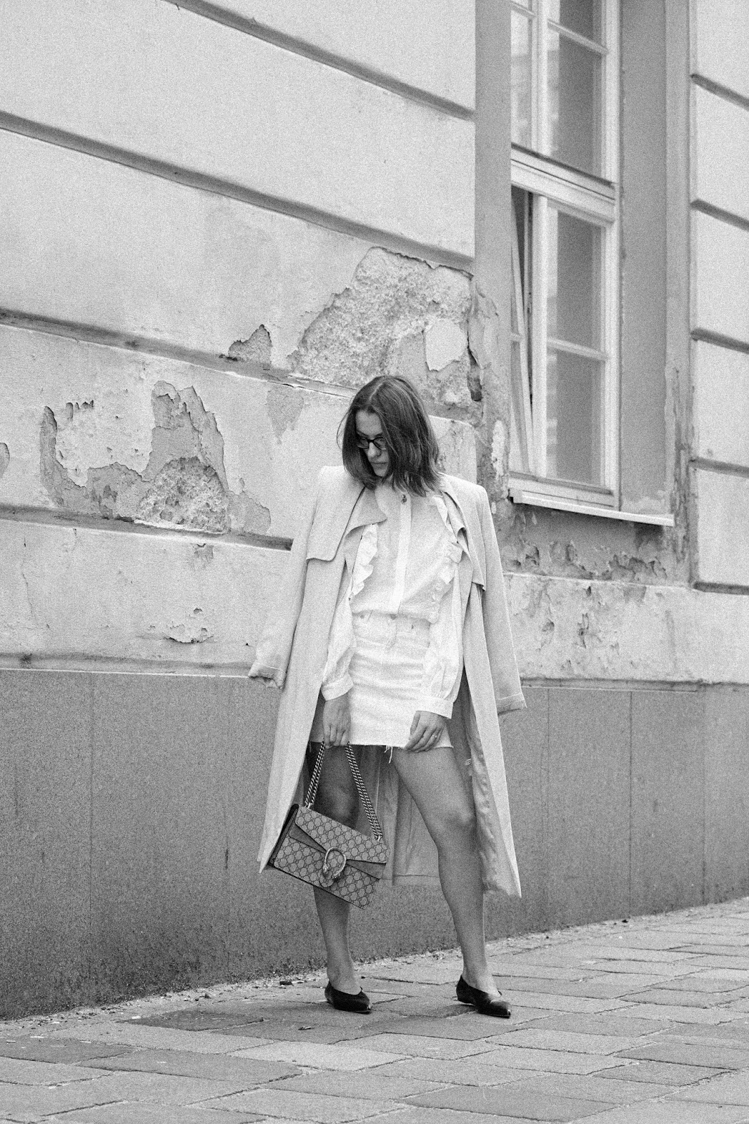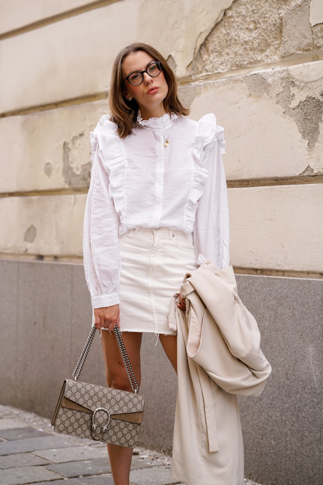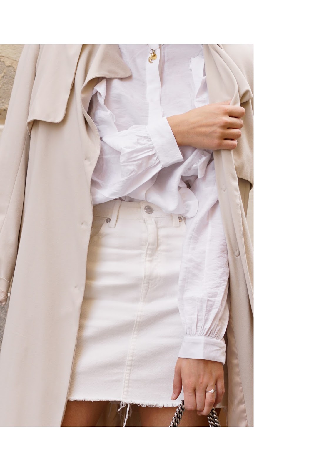 ALLWHITE VOLANTS // WEARING – trench coat, volants blouse, denim skirt, flats: h&m // earrings: chanel // bag: gucci