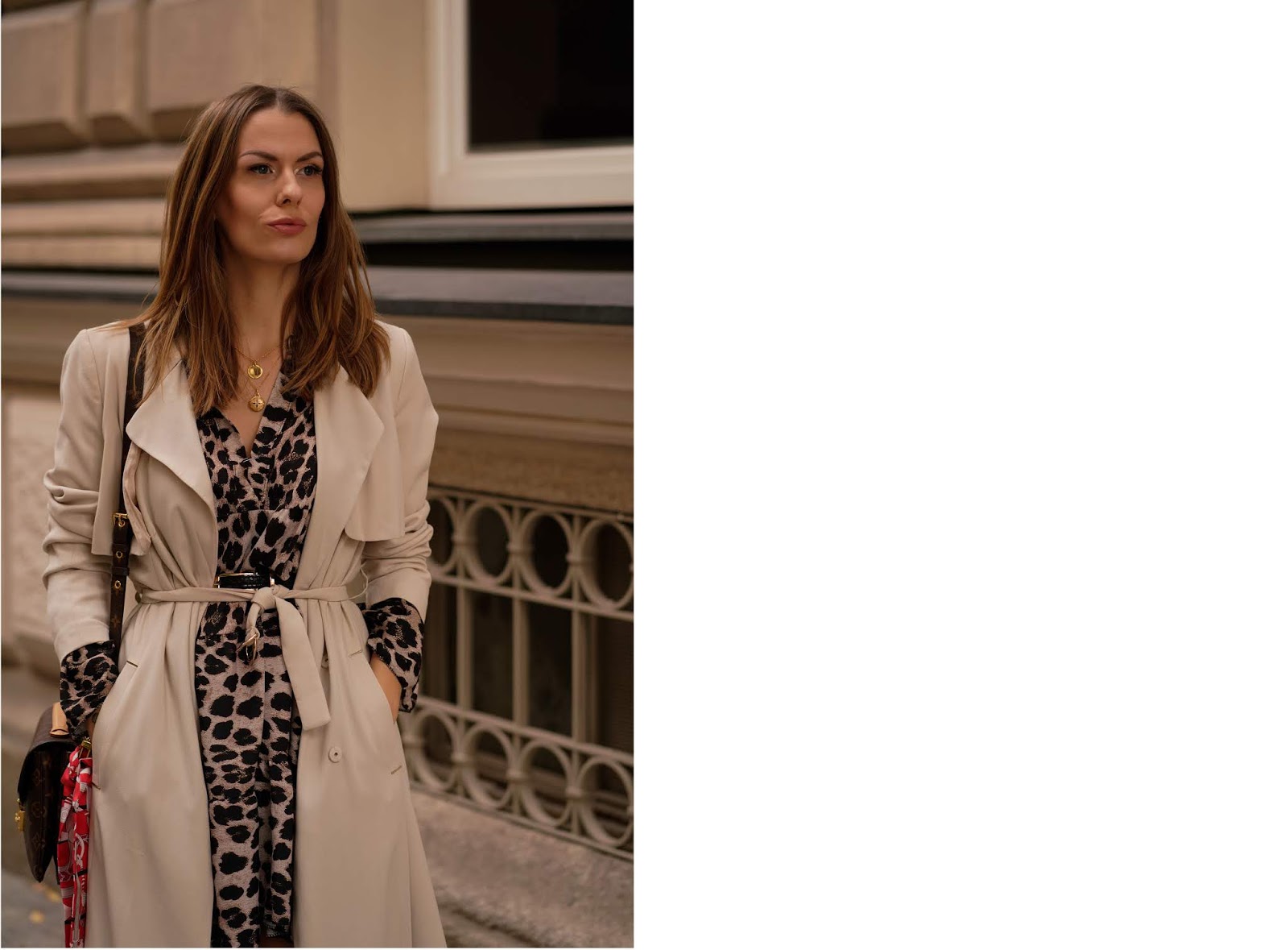 Ich liebe die Kombi mit dem Animal Print und dem Trenchcoat. Die Farben sind super abgestimmt und ich mag den roten Akzent durch das Tuch. Super gelungen 🙂