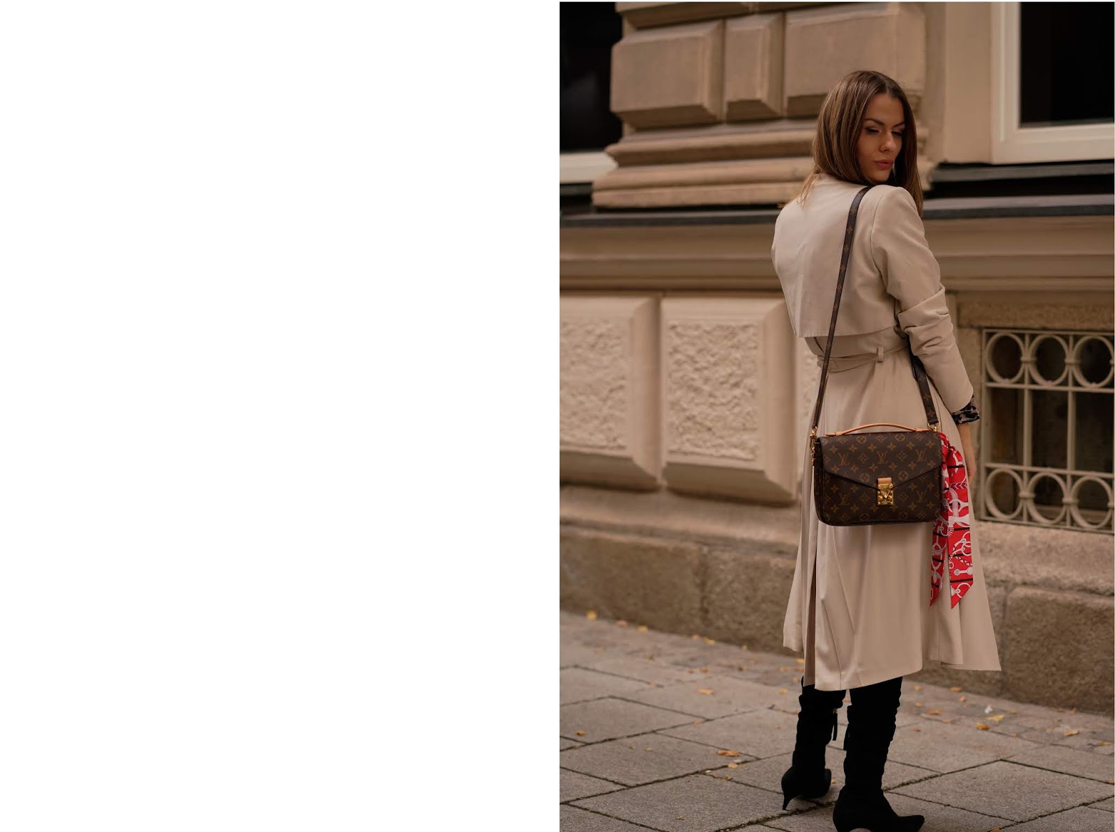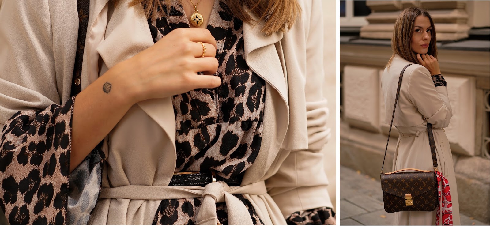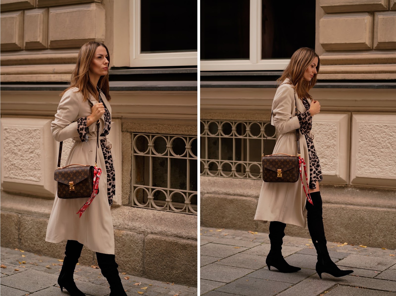 Ich habe mein Leo Kleid mit einem klassischen Trenchcoat von H&M und Overknees von ZARA, einem Gürtel von MANGO und meiner LOUIS VUITTON Metis kombiniert.