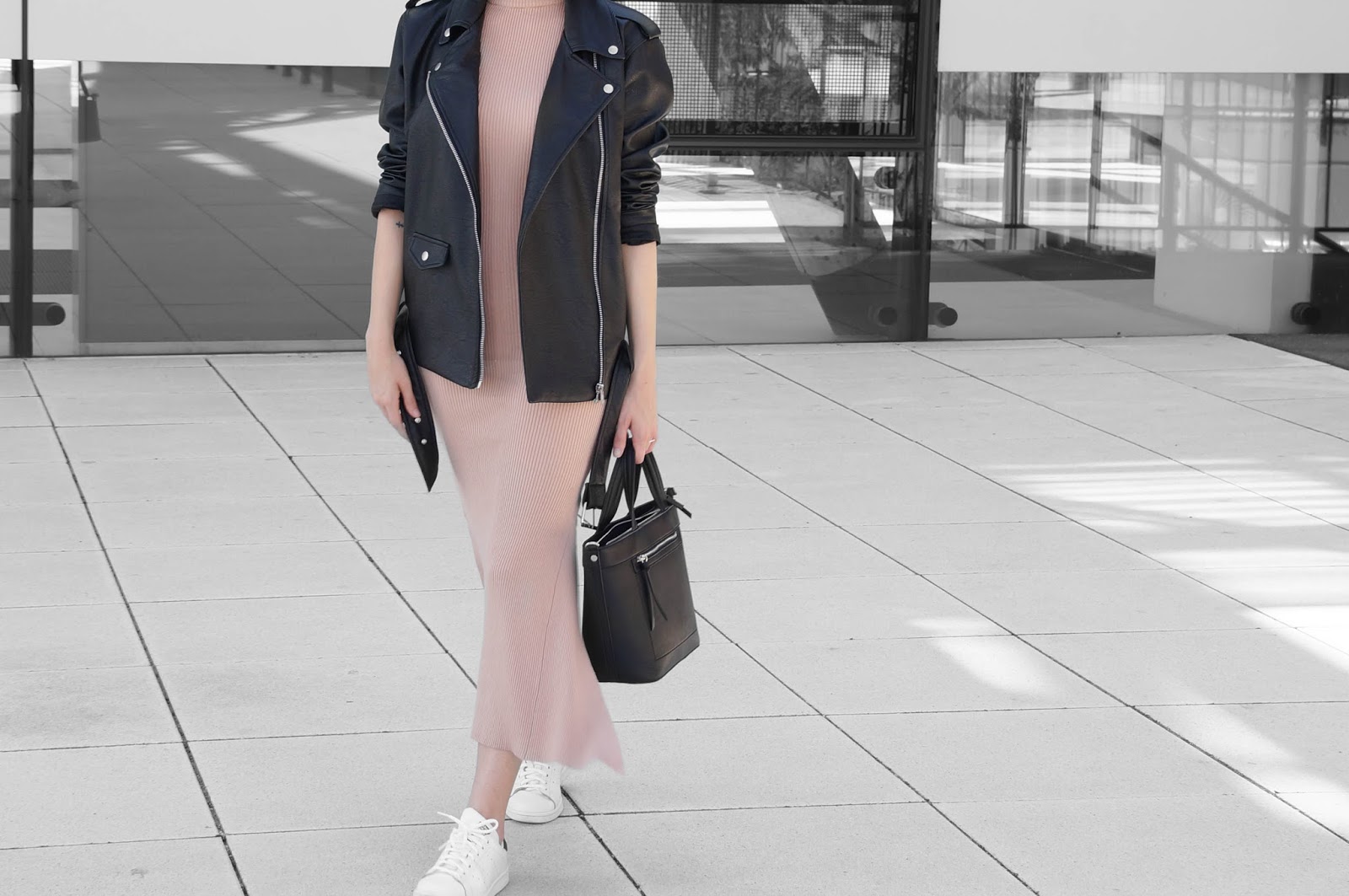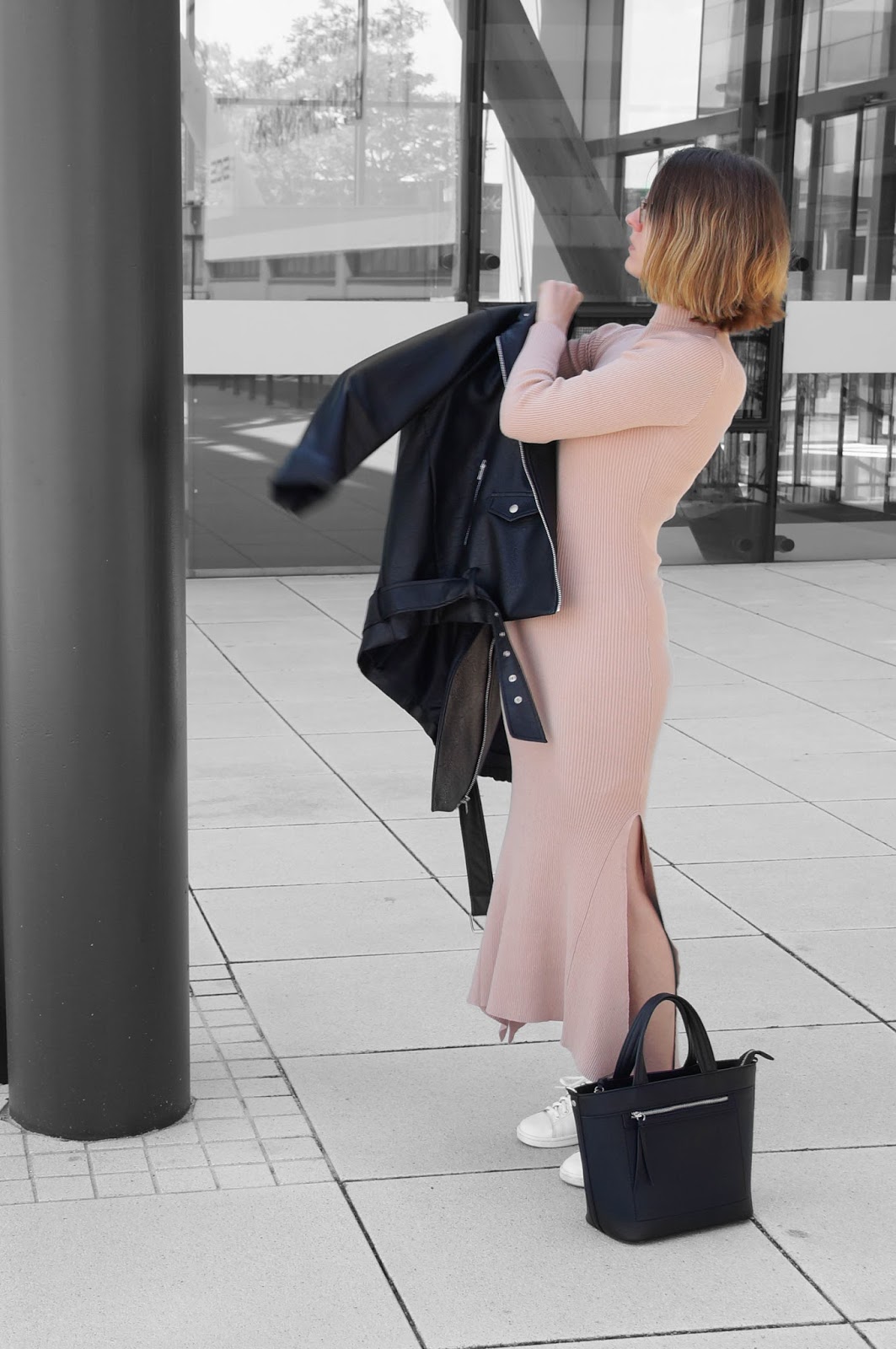 WEARING – knit dress: na-kd // leather jacket: oak&fort // bag: mango // sneakers: adidas stan smith // rings: jukserei