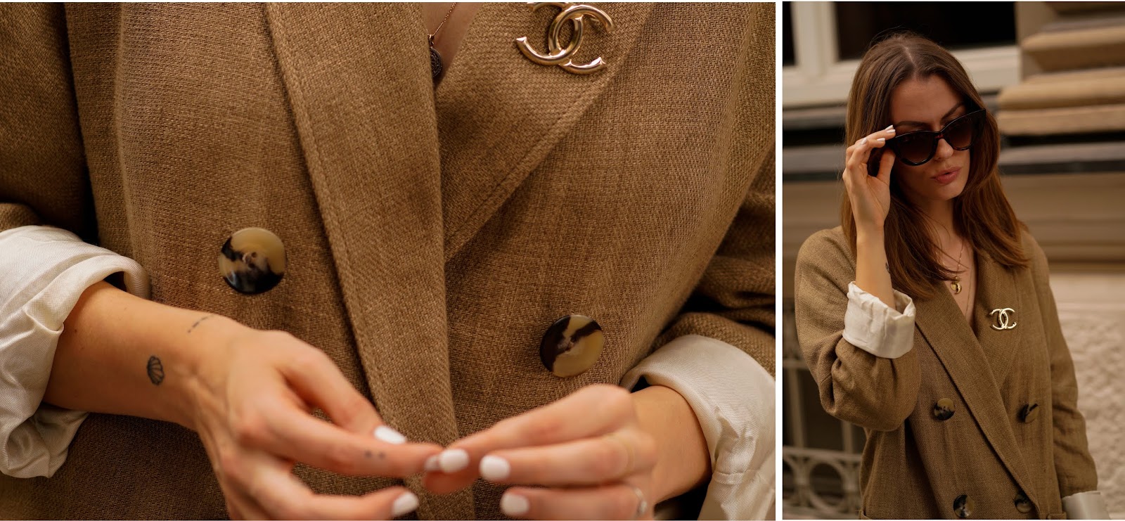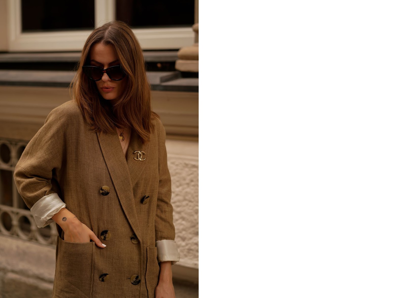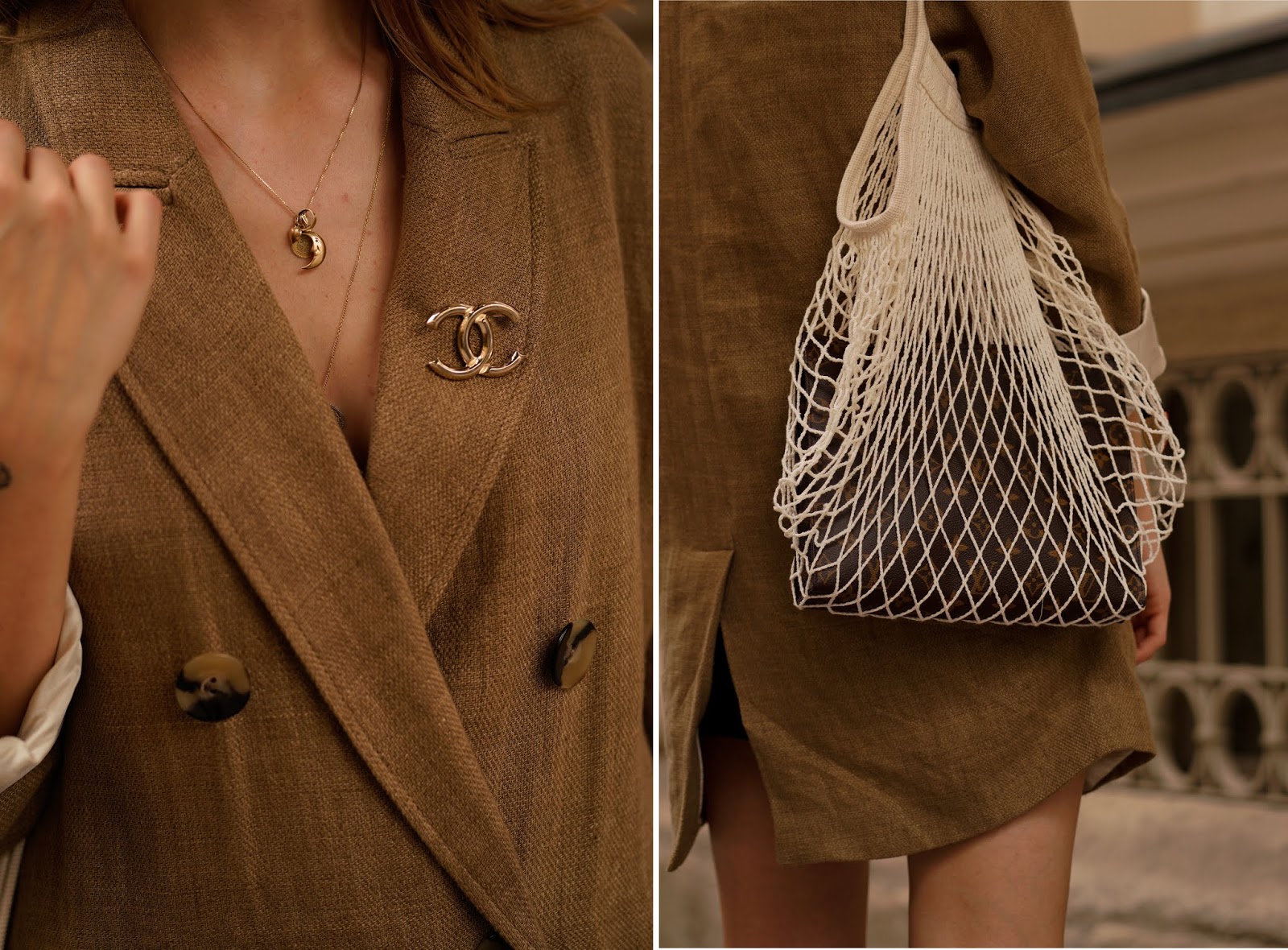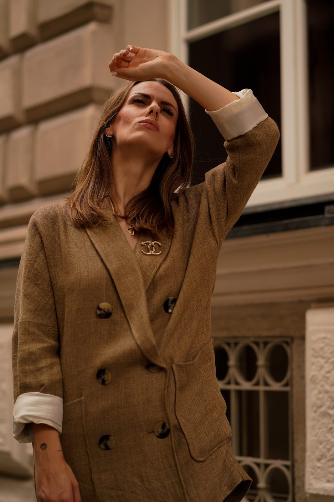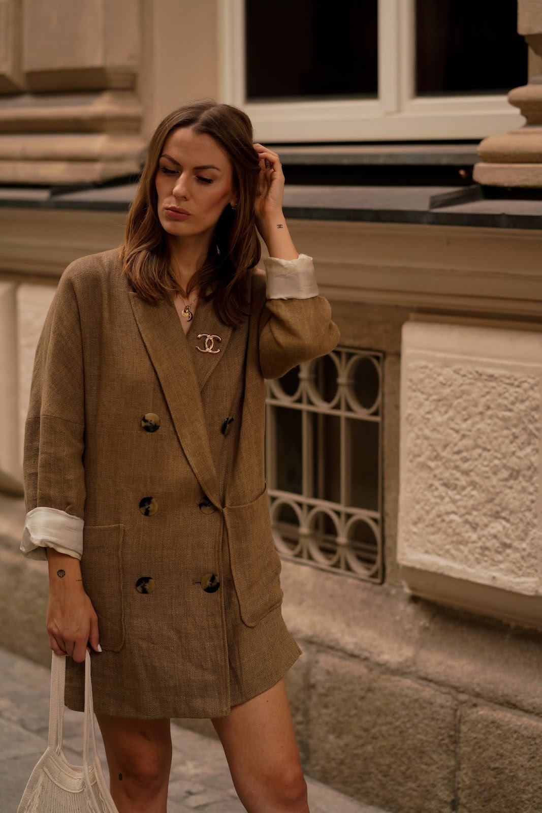 Wie das kleine Schwarze oder der Trenchcoat zählt auch der Blazer zu den absoluten Must haves in jedem Kleiderschrank: Er ist elegant, klassisch und vielseitig einsetzbar – er eignet sich für fast jeden Anlass und jede Outfitkombi. Wem ein Klassischer schwarzer Blazer auf Dauer aber zu langweilig ist, wählt am besten ein Modell mit traditionellen Mustern und zwei Knopfreihen. Auch Oversized Blazer mit breiten Schultern und weiter Passform in herbstlichen Farben wie Braun, Cognac und Dunkelblau machen sich jetzt perfekt. Ich würd euch darüber hinaus ja noch wärmende Materialien wie Baumwolle oder Kaschmir für die ersten kälteren Tage empfehlen, aber die sind bisher noch ausgeblieben. Aufgrund der warmen Temperaturen hab ich daher einfach mal auf meine Hose „vergessen“ und präsentiere euch einen meiner liebsten Oversized Blazer als Kleid (in den Beiträgen SUMMER NEUTRALS und SAFARI LOOK hab ich ihn euch bereits in seiner Funktion als Blazer gezeigt). Von der Vielseitigkeit von Blazern überzeugt? Sehr gut! ☺ Ich trage einen Leinenblazer von ZARA, Flats von H&M, eine Netztasche von BERSHKA und dazu meine LOUIS VUITTON Clutch.
