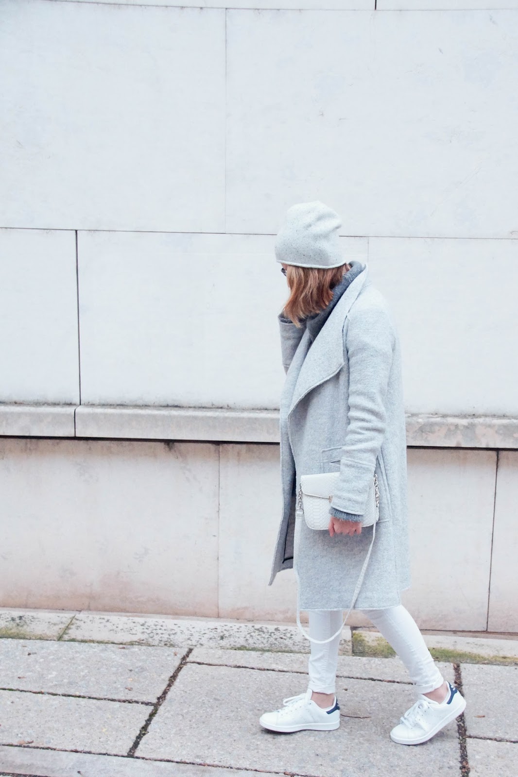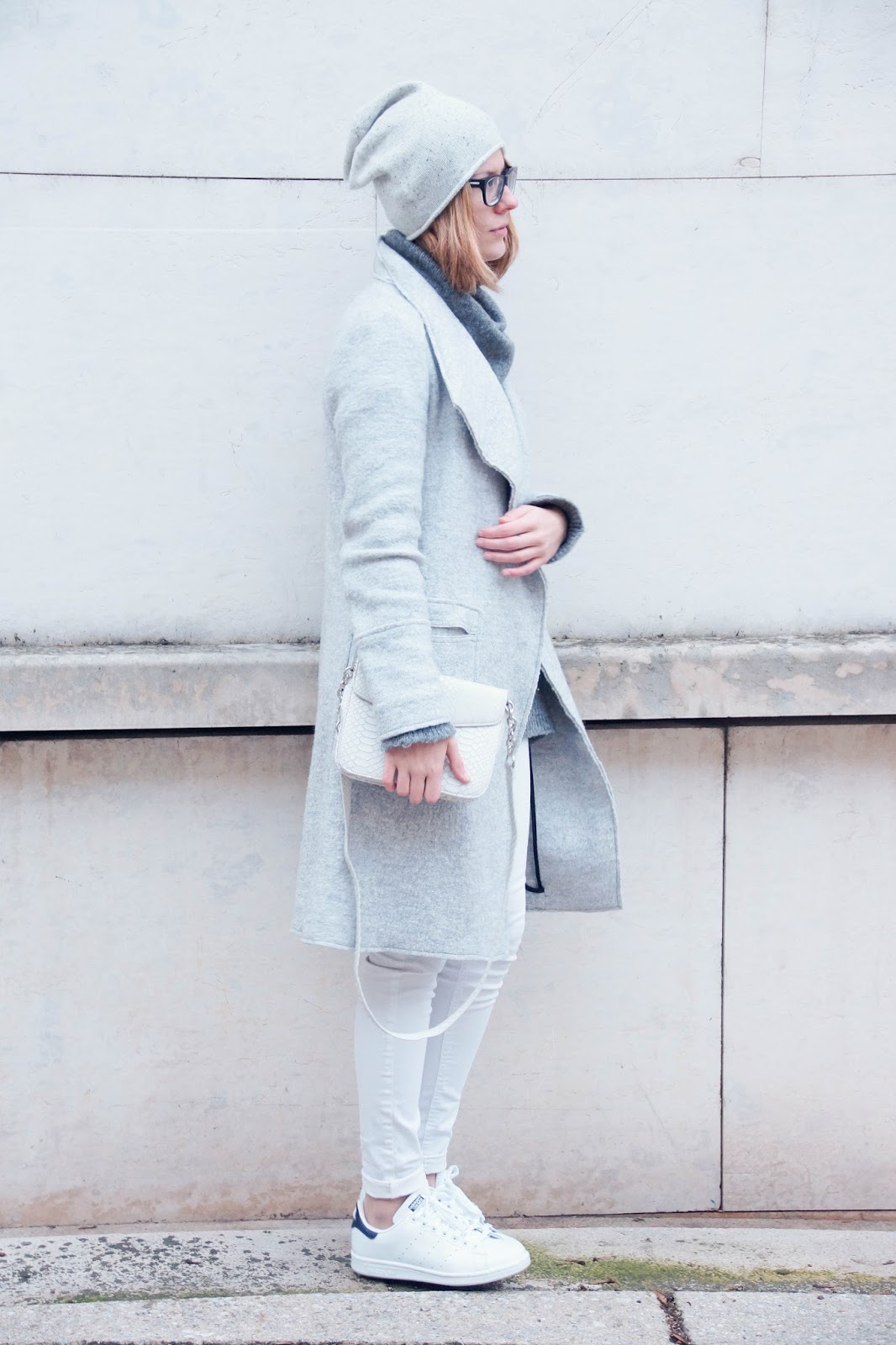 Nach der ganzen Völlerei und dem Faulenzen auf der Couch die letzten Tage musste ich gestern dringend mal wieder an die frische Luft. Daher haben der Herr und ich einen Stadtbummel unternommen und bei der Gelegenheit gleich mal ein neues Outfit geshootet. Das erste Outfit im neuen Jahr ist diesmal in etwas zarteren Farben gehalten und ein totales wohlfühloutfit … Das Wetter war toll, daher hab ich mal wieder meine weißen Jeans hervorgeholt und der hellgraue Zara Wollmantel gehört momentan ohnehin zu meinem Outfit-Standardinventar … Mit dickem Pulli, meinen heißgeliebten Stan Smith (wohl eine der besten Investitionen 2015) und meiner neuen Kashmir Haube von Cos steht einem entspannten Bummel nichts im Weg.