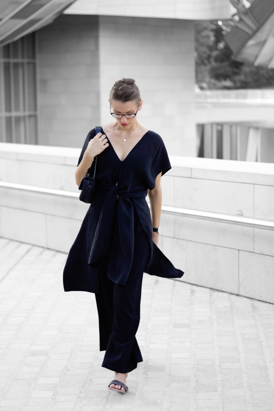 Da sich die spannend und raffiniert geschnittenen Teile durch Binden oder Knoten optisch verändern lassen, konnte ich nicht anders und musste euch noch einmal ein Outfit mit meiner Too Damn Expensive Tunika ablichten. Ich wusste schon vor unserer Parisreise, dass ich den Look unbedingt vor der Fondation Louis Vuitton fotographieren wollte. Die dekonstruktivistische Architektur Gehrys lässt sich so wunderbar mit den dekonstruierten Schnitten des Labels vereinbaren. Hier ist der gemeinsame Nenner des Looks auch schon gefunden: deconstructivist. Während ich das Oberteil in meinem ersten Outfit frei habe fallen lassen, so habe ich mich diesmal entschieden, die beiden vorderen Teile zu verknoten und so einen Kontrast zur weiten Culotte zu schaffen. Im Allgemeinen gefällt mir diese luxuriöse Weite des Looks mit seinen leichten, fließenden Stoffen. Der Schnitt des ganzen Outfits hat zudem etwas traditionell Japanisches, was ich besonders spannend finde … Stay tuned for more Too Damn Expensive!