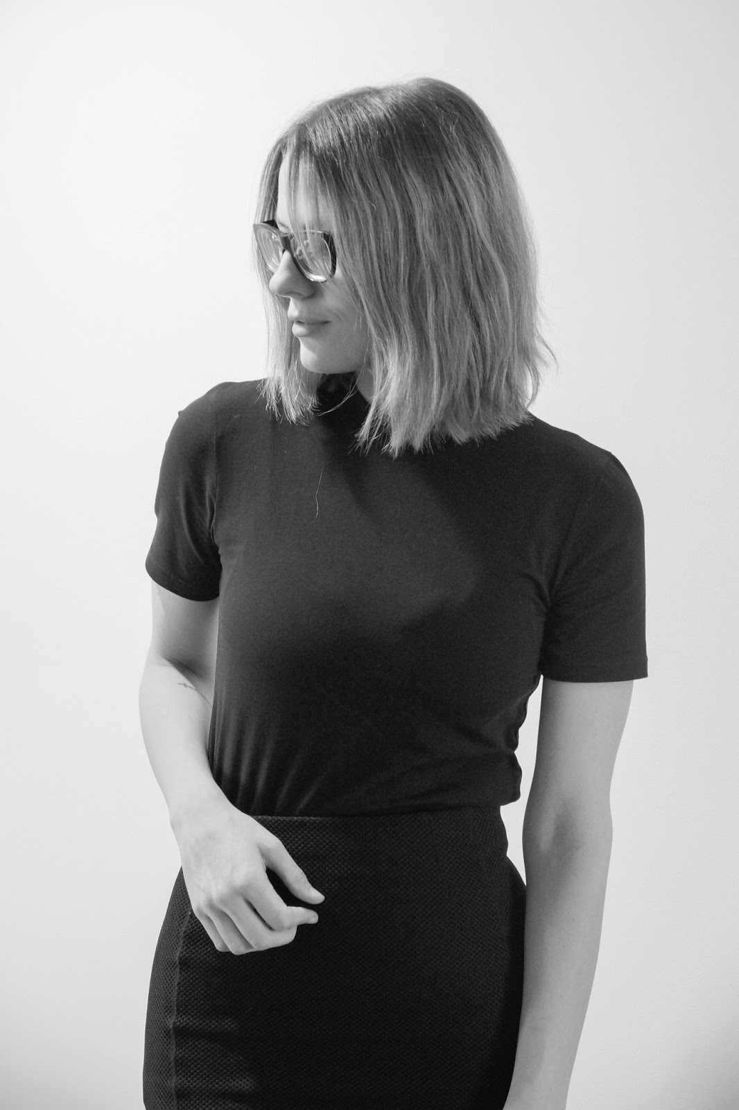 Ich hab mich für das Clean T-shirt in Organic Cotton in Größe M entschieden (das Shirt hat eine enge Passform und ich mag’s gern etwas lockerer), da ich den Stehkragen so chic finde und er das Shirt besonders macht. Schnitt und Passform finde ich super, das Material fühlt sich glatt und angenehm auf der Haut an und ich denke, dass es mir noch lange so schön erhalten bleibt. Ich trage das Shirt sogar zur Arbeit (obwohl ich dort, bis auf Ausnahmen, immer sehr formell gekleidet bin). Ähnlich habe ich es auch für die Blogfotos gestyled. Einfach einen schwarzen Pencilskirt dazu und fertig ist der Business Look. Was sagt ihr?