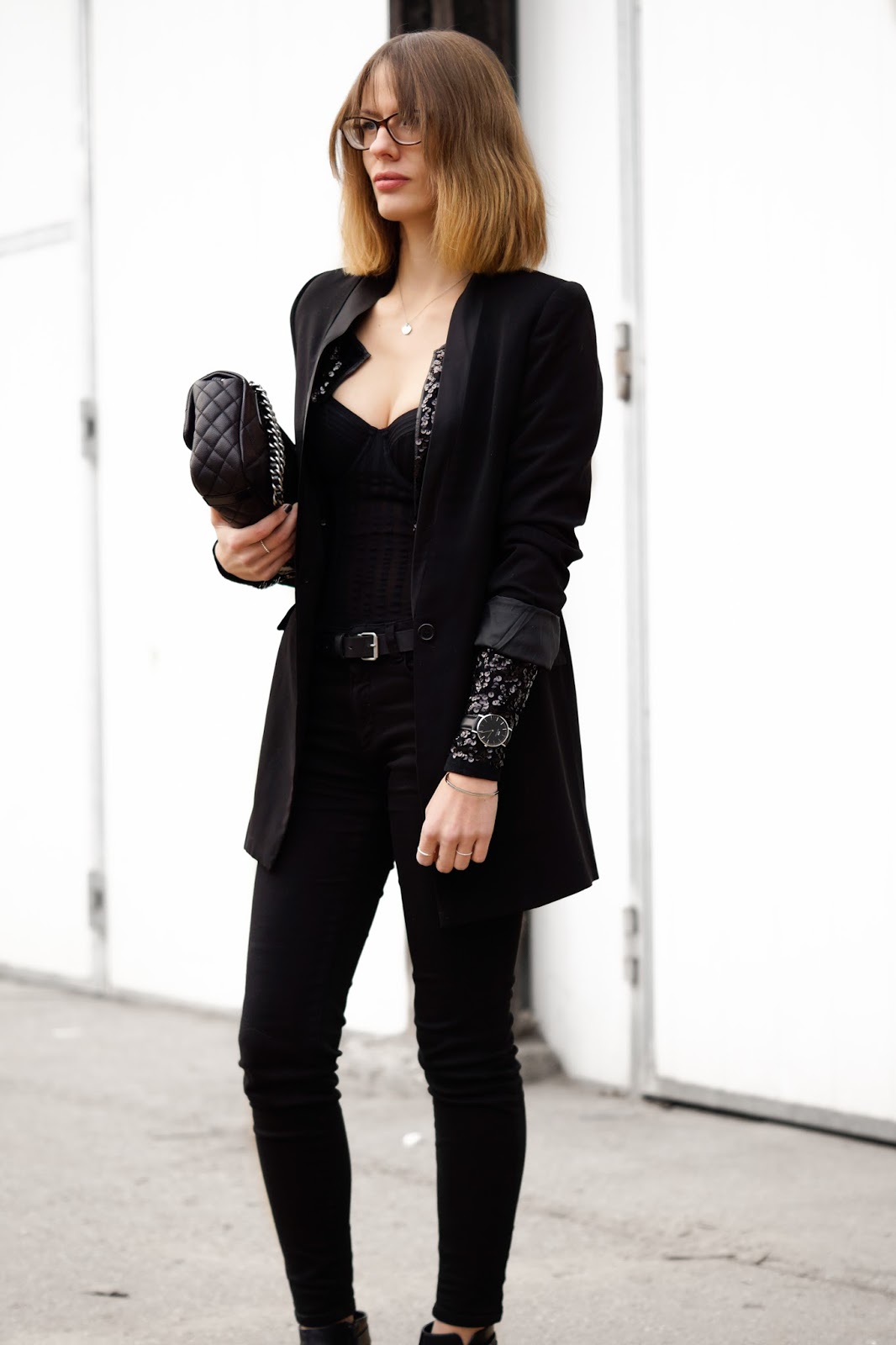 Daher wollte ich eigentlich eine einfache Anzugkombination mit Spitzenshirt anziehen, habe dann aber entschieden, dem Look mit Pailletten einen etwas glanzvolleren Touch zu verleihen (ich wollte mir heuer ja unbedingt endlich ein Paillettenshirt zulegen, hab aber wieder zu lange überlegt und es wäre nicht mehr rechtzeitig angekommen). Daher habe ich in letzter Minute mein uraltes Pailetten Jäckchen wieder hervorgekramt. Besonders zu Weihnachten und Silvester finde ich Pailletten ganz besonders passend. Sie haben etwas sehr festliches an sich. Um das Ganze dann noch ein wenig sexier zu gestalten, hab ich meinen Body einfach mal in eine Corsage umfunktioniert. Zum Pailetten Jäckchen von H&M trage ich einen Blazer von FOREVER21, einen H&M Body, ZARA Jeans, DEICHMANN Boots und meine CHANEL.