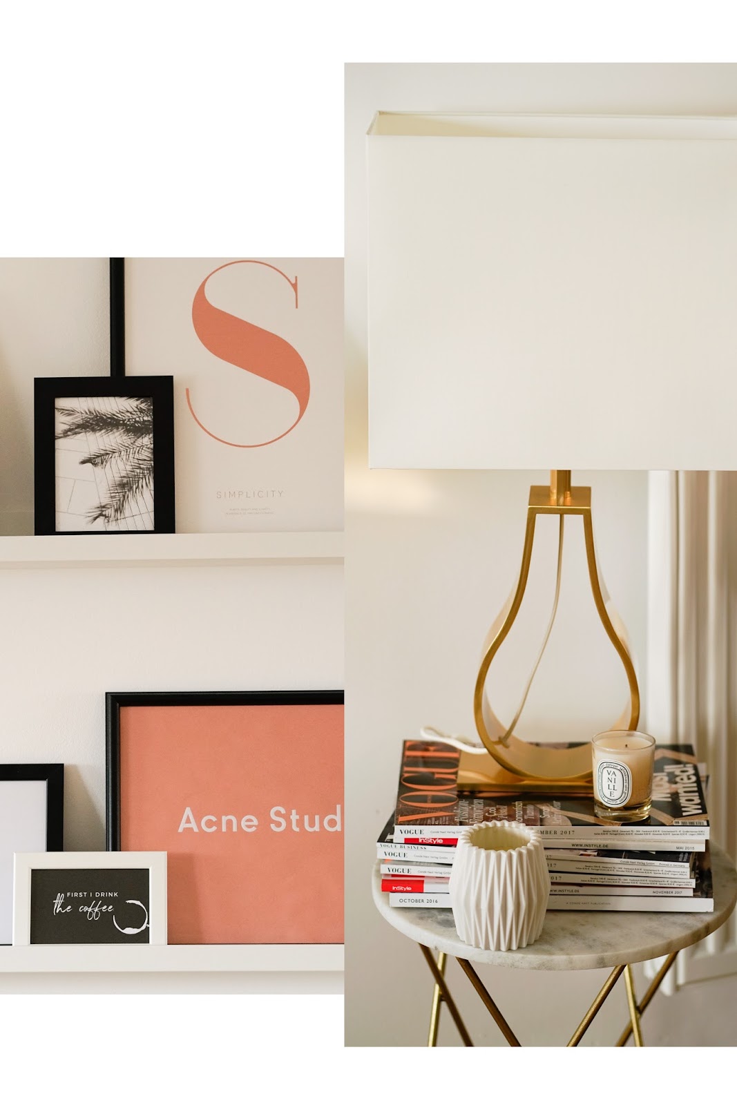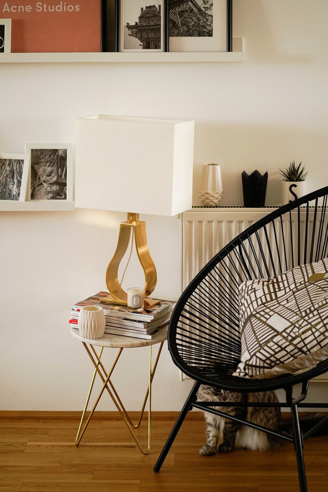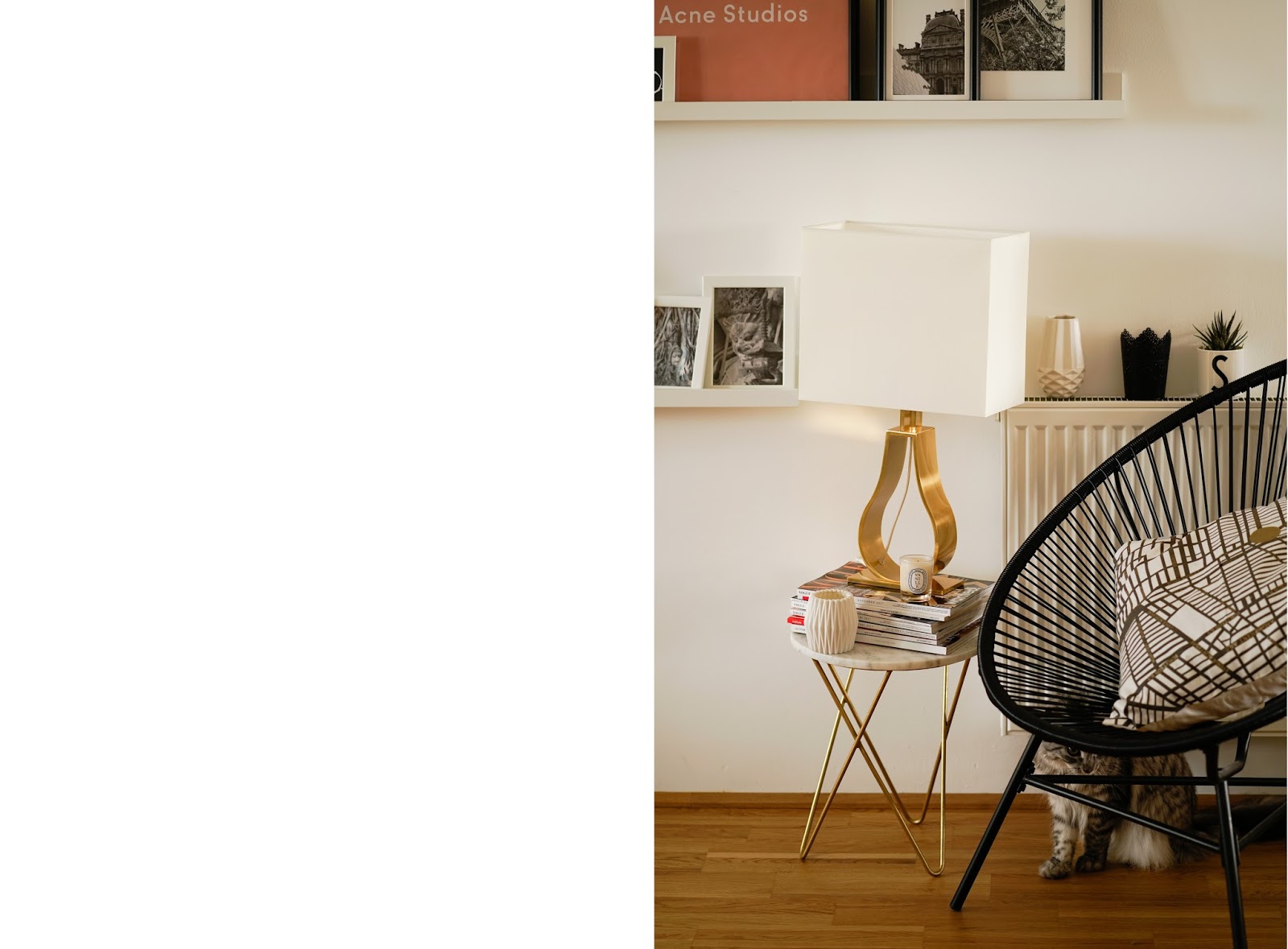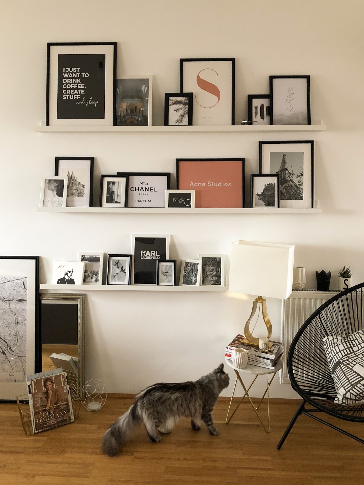 Bei meiner Gallery Wall war ich mir von Anfang an sicher, dass ich die Bilder zwar einrahmen, nicht aber direkt an der Wand anbringen wollte. Ich hab mir daher einige Bilderregal von Ikea besorgt, um die Fotos und Prints darauf zu arrangieren. Weil unser Interior doch recht reduziert ist, habe ich alle Bilder und auch deren Rahmen, bis auf ein paar kleine Farbtupfer, in schwarz-weiß gehalten. Damit das Ganze aber dennoch nicht zu eintönig wirkt, hab ich mich für ganz viele unterschiedliche Größen entschieden. Auf der einen sieht schließt die Heizung die Gallery Wall ab, auf der anderen Seite ist es der große Landkarten Print von Paris. Auch den Bereich vor der Gallery Wall hab ich nochmal gänzlich umgestaltet und mir eine richtig schöne Wohlfühlecke gestaltet. Besonders verliebt bin ich in die tolle Lampe, die ich bei unserer letzten Ikea Tour entdeckt habe und unbedingt haben musste, und in meinen Marmor-Beistelltisch.