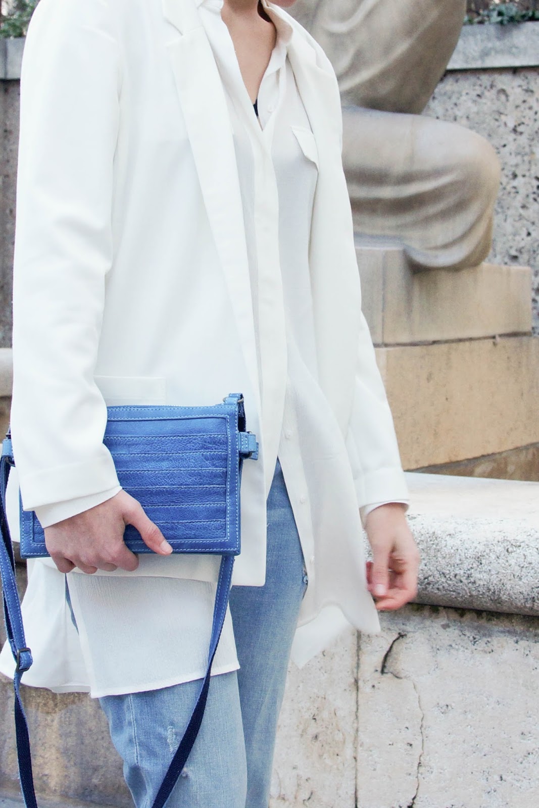 When I first saw my beautiful, blue Fredsbruder minibag, I thought „Denim“ immediately. For this reason, I finally rummaged around the closet for my girlfriend jeans again. I don’t wear denim that often, even though I really love it on other girls … But I always hold that they don’t really fit me well (or at least I’m just not used to me in jeans …), for what always takes me trying on about 100 boyfriend jeans before finding this right model, in this case a girlfriend jeans by H&M. In turns of combining jeans, I’m much surer however, I love denim and white according to the motto: blue jeans white shirt 🙂