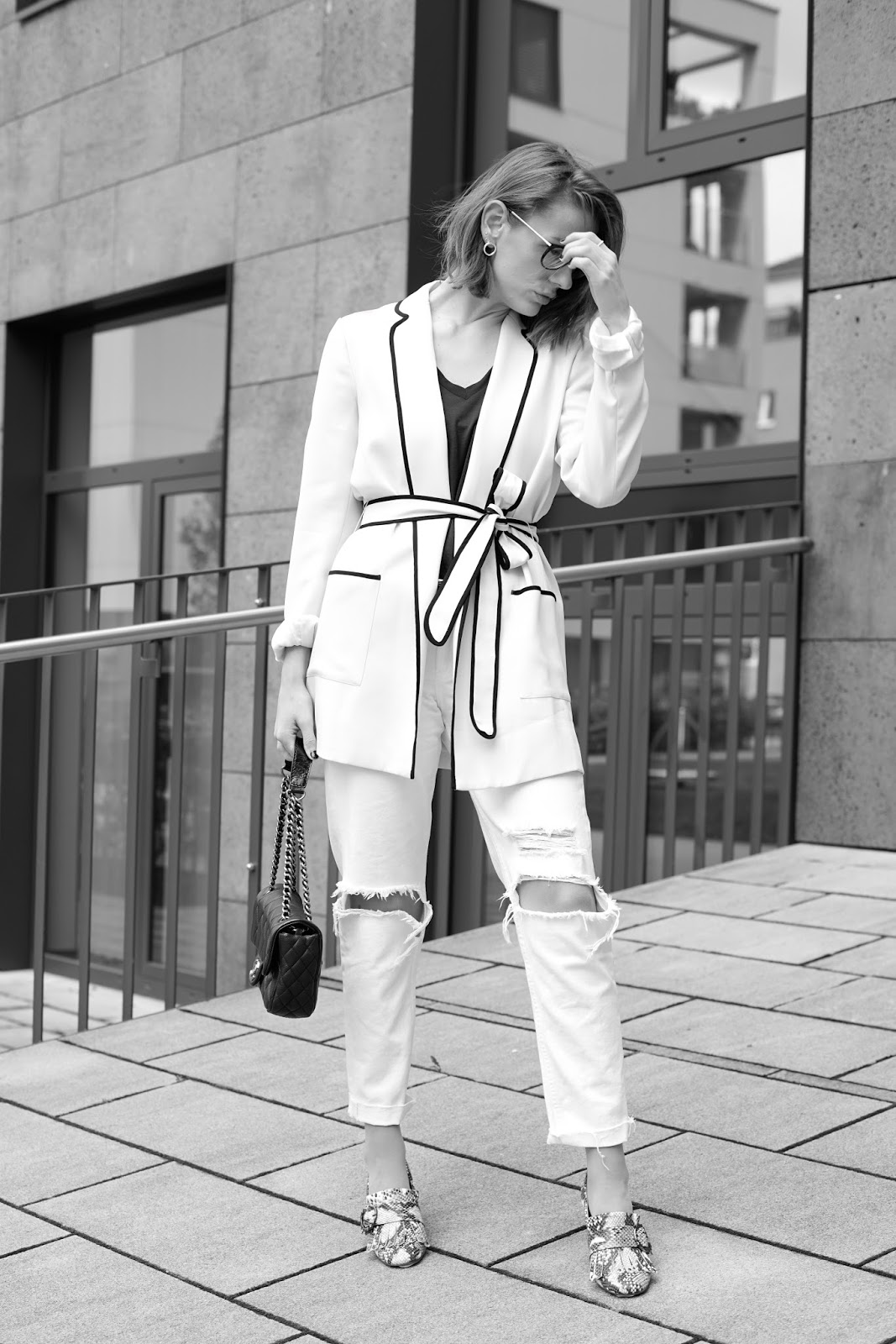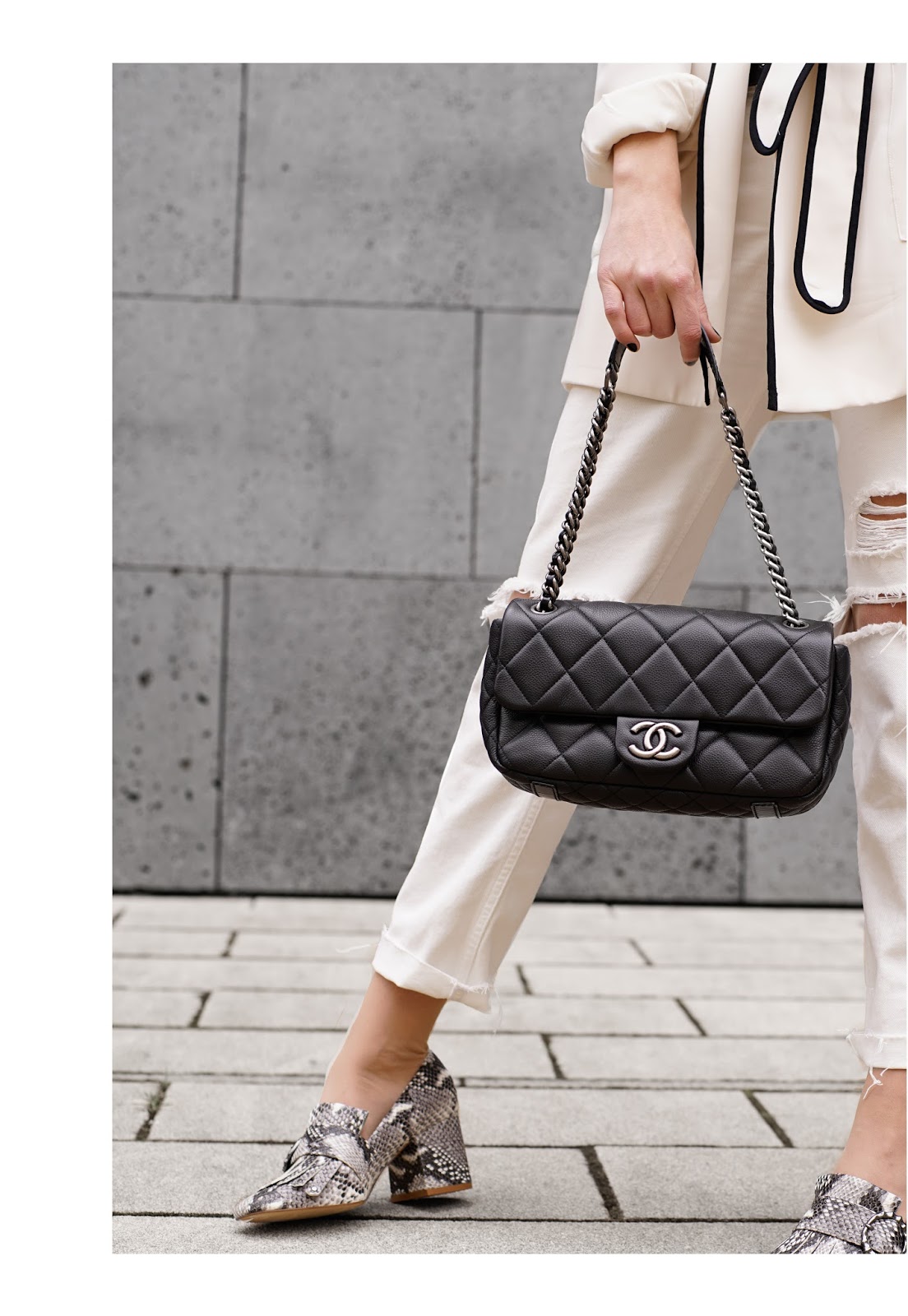 I love subtle colors and think, the offwhite Zara blazer couldn’t be more perfect. To create a more casual look for the weekend I wear ripped jeans. The eyecatcher of this outfit definitely are the amazing Gucci lookalike shoes from mango in snake print, which I really love! I wear blazer and shirt from ZARA, a H&M girlfriend jeans, Gucci lookalikes from MANGO and my CHANEL.