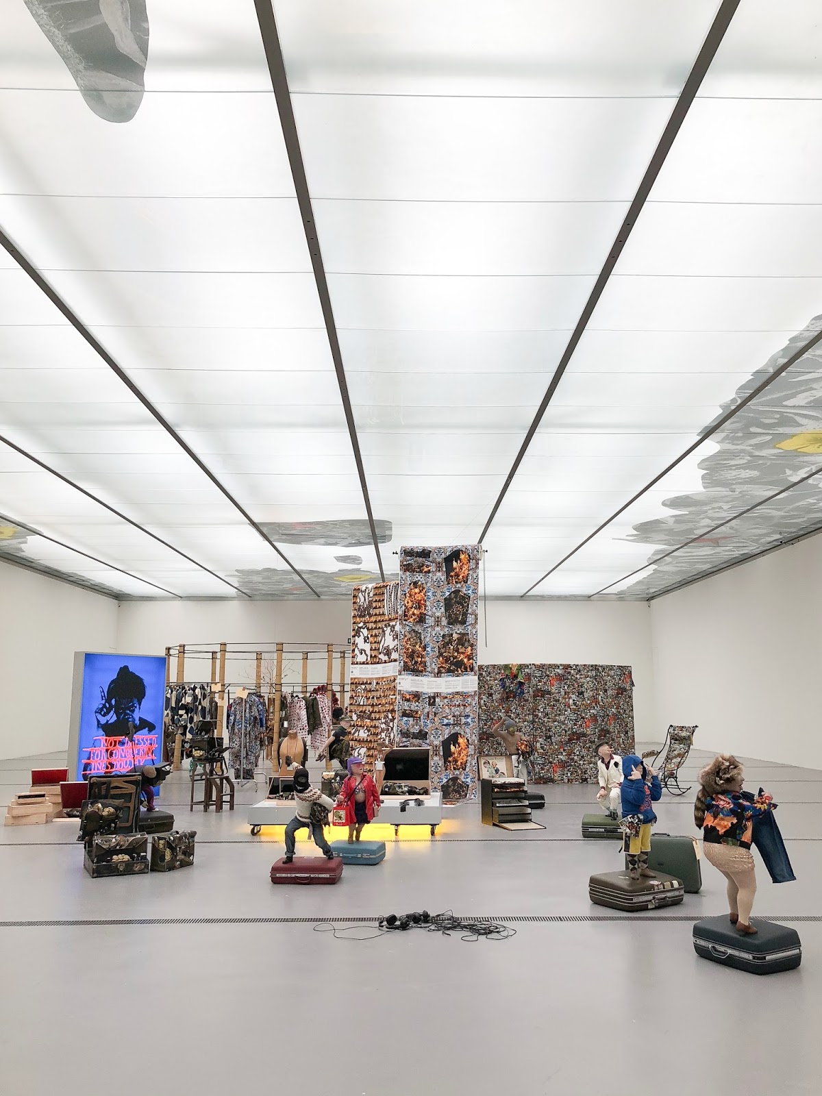 Ich liebe Museen, ich liebe Kunst und ich liebe Mode. Daher habe ich mich sehr über die Einladung gefreut, mir im kleinen Kreis mit persönlicher Führung die Ausstellung Ines Doujak Sale im Lentos Kunstmuseum anzusehen. Schon beim Betreten des Foyers nimmt einen die Ausstellung mit dem Werk Der Teufel eröffnet eine Abendschule in ihren Bann und regt zum Nachdenken an. Von hier aus zieht sich die Exposition bis in den Großen Saal des Museums.