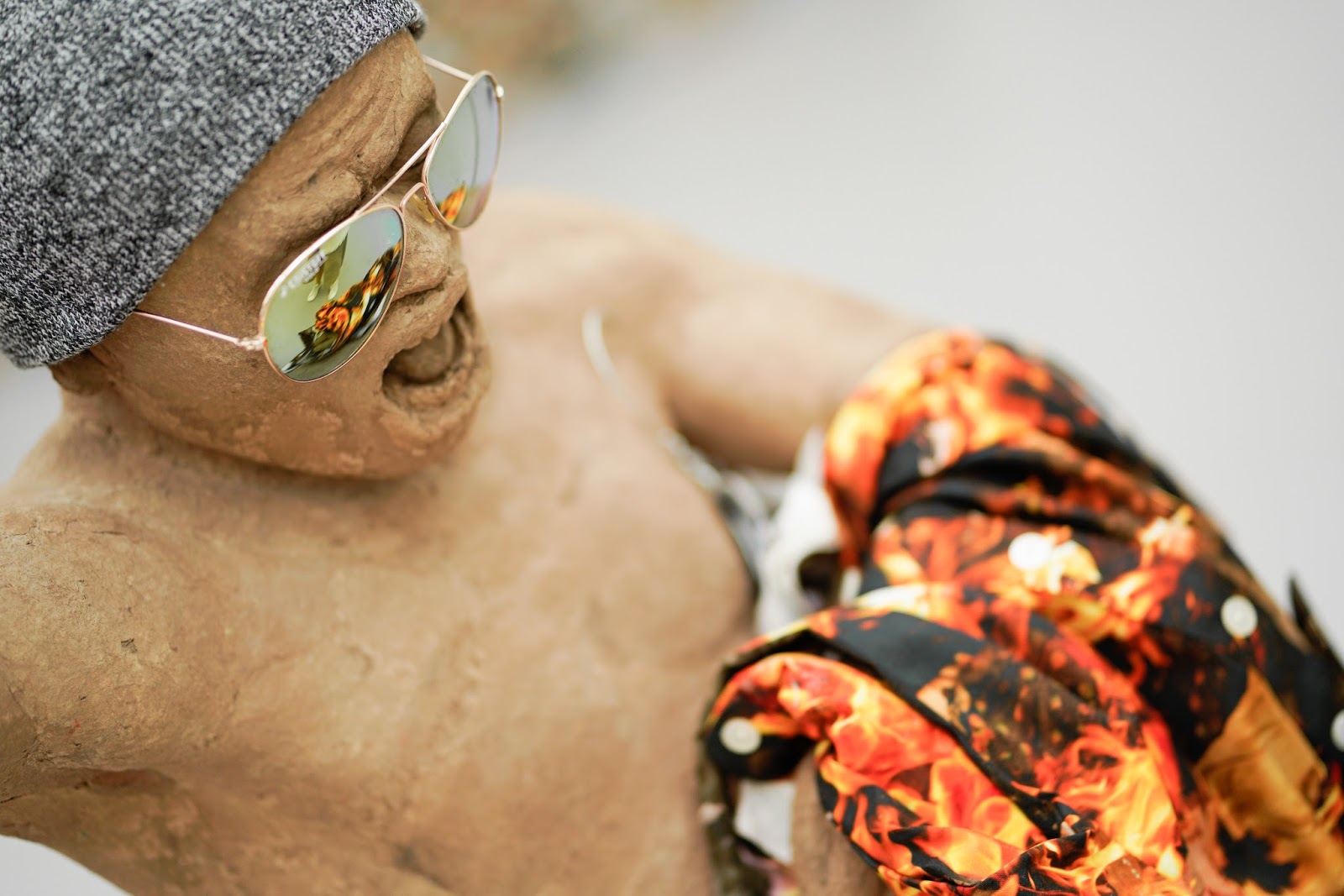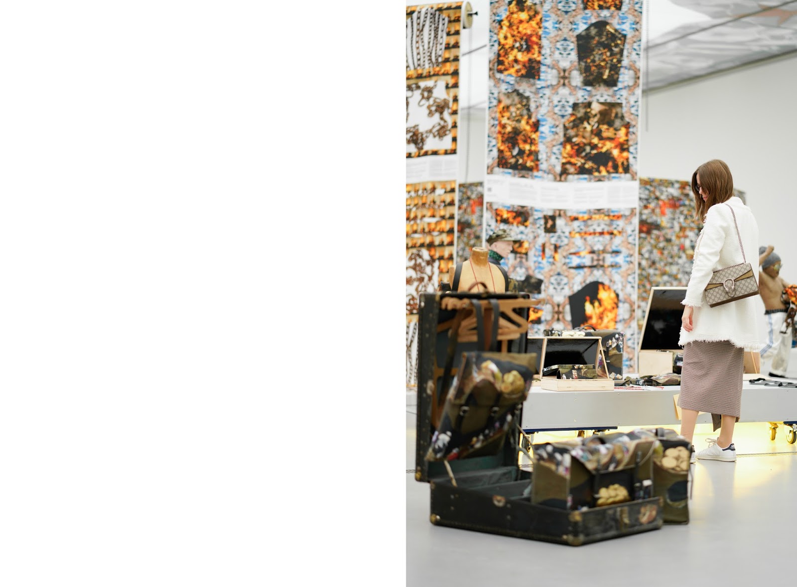 Trotz aller Genialität umfasst Sale zwei Ausstellungsstücke, die mich besonders in ihren Bann gezogen haben: Der Kriminalaffe und Feuer. Kleider, ein Paravent und ein Schaukelstuhl sind aus einem Stoff überzogen, der aus Bildern von Affen und Menschen besteht. Der Schriftzug „Class Hatred“ verweist auf die Thematik der sozialen Herkunft und des Rassismus. Ich musste dabei unweigerlich an die H&M Werbung denken, die im Januar für großes Aufsehen gesorgt hatte. Darauf trug ein dunkelhäutiger Junge einen Hoodie mit dem Print „Coolest monkey in the jungle“. Feuer, Ketten und nackte Menschen bilden ein Printmuster auf Stoffen und Kleidungsstücken des Werkes Feuer. Sie symbolisieren nicht nur Burnout, fehlende Sicherheitsstandards und Brände in Textilfabriken, sondern verweisen auch auf FabriksarbeiterInnen, die die Fabriken oder sich selbst aus Protest anzündeten.