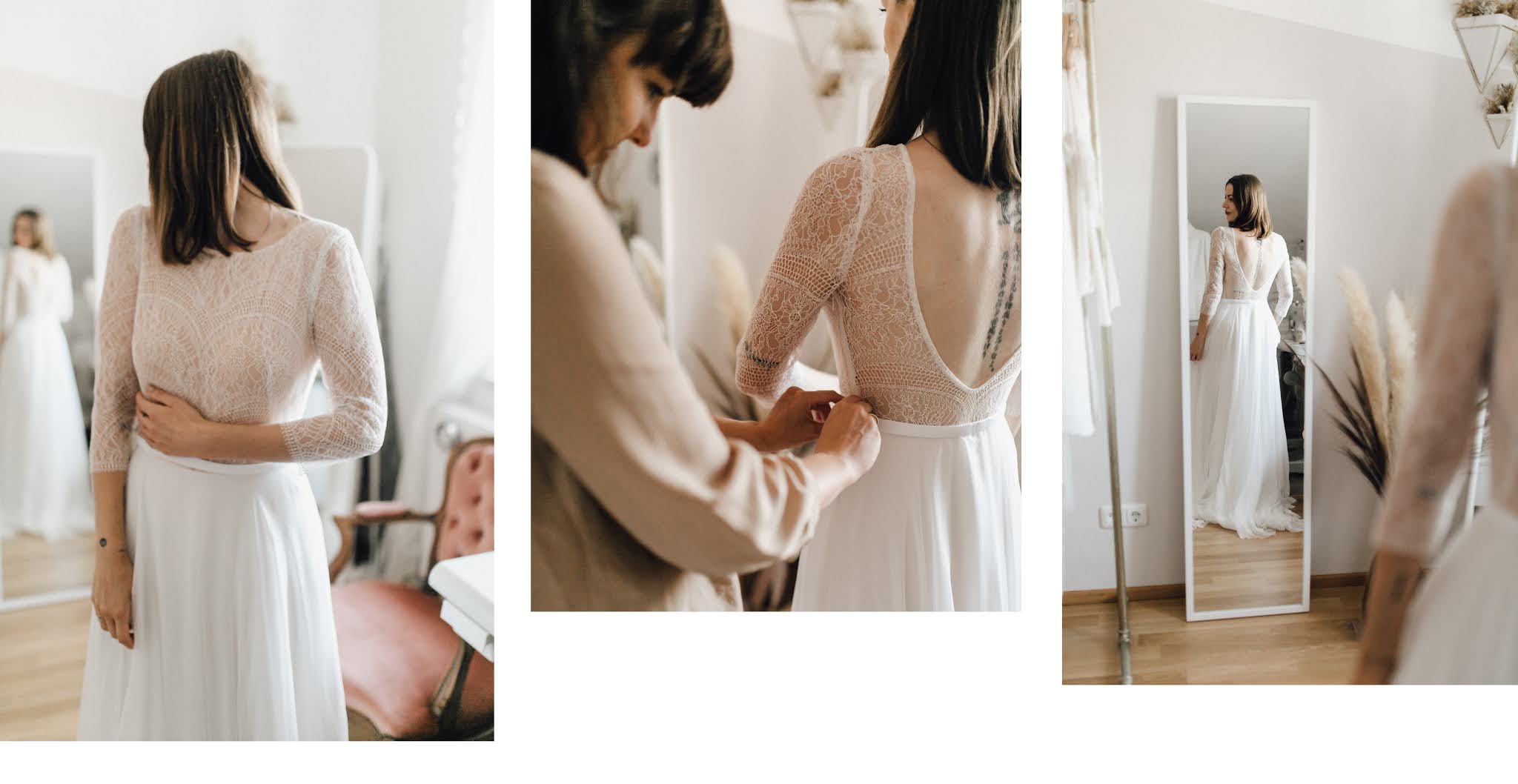 I already had my eye on a very special dress of Julia Sophie‘s collection before even making an appointment. It actually was the first wedding dress I ever tried. Upon my first look in the mirror wearing a wedding dress it dawned on me — I was really going to be a bride! And suddenly the whole marriage thing began to feel quite real although Petzi and I had been engaged for almost 3 years at this point. But as Julia Sophie‘s dresses are just too gorgeous I kept trying them on and let me tell you — each and every one would have been a real perfect fit! I‘m still really sad about being just able to wear one dress at my wedding, haha 😆 But I wanted a dress that really cried out for me and in the process of trying them all on something really remarkable happened – I actually changed my mind and decided for another one than the design I had originally picked 🙌🏻