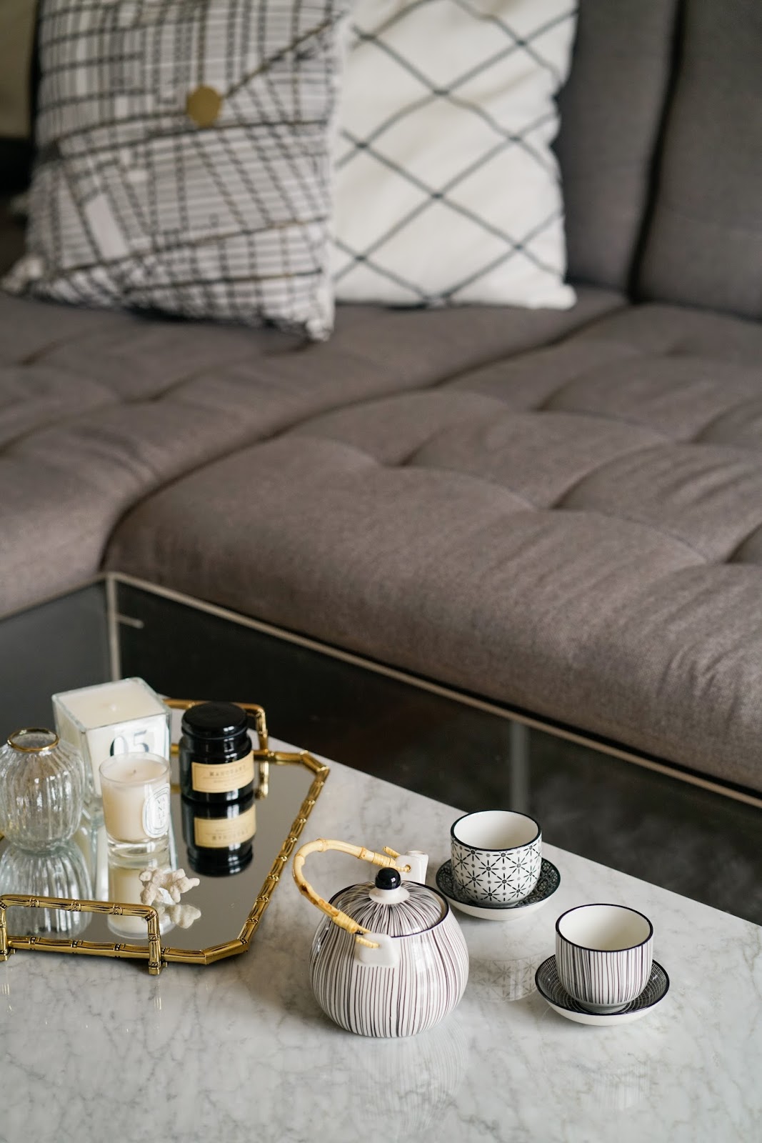 MARMOR & GOLD DETAILS – marmor couchtisch: interior (ähnlicher hier) // tablett: h&m home (ähnliches hier) // kerzen: dyptique & h&m home // beistelltisch: zara home // stehleuchte tolomeo mega floor: artemide // couch: xxxlutz // dekokissen: h&m home // tee service: mömax