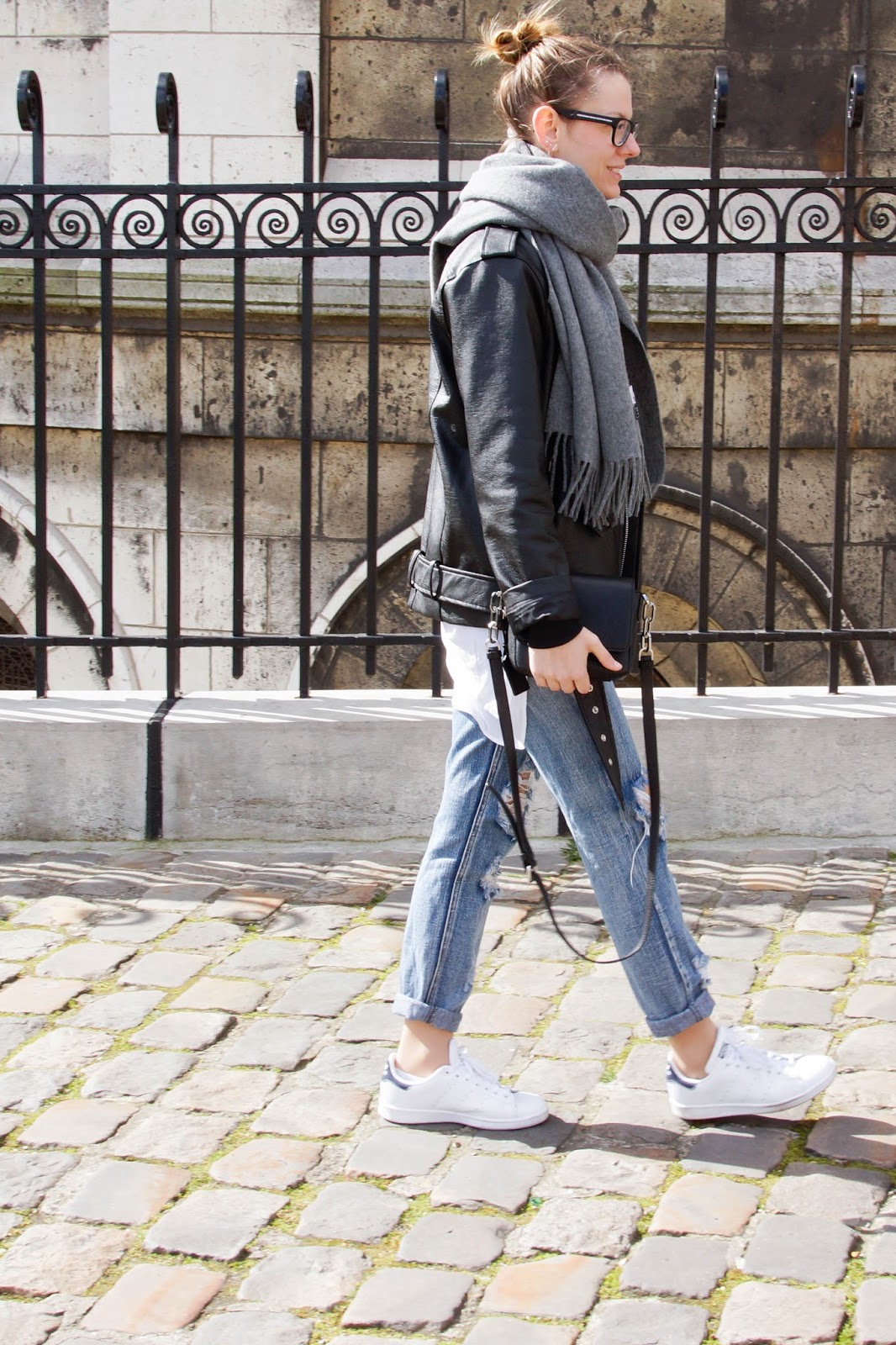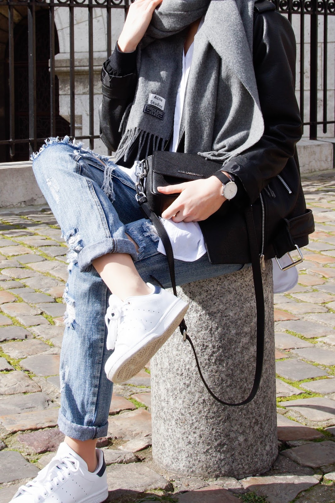 WEARING – leather jacket: oak&fort // blouse: h&m // jeans: one teaspoon // scarf: acne studios // sneakers: adidas stan smith // bag: karl lagerfeld