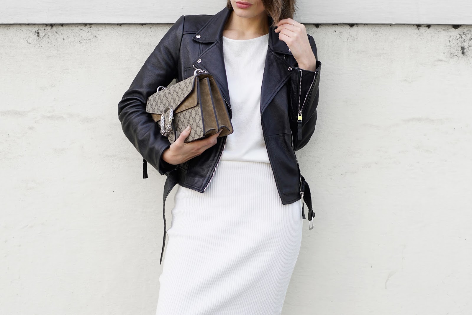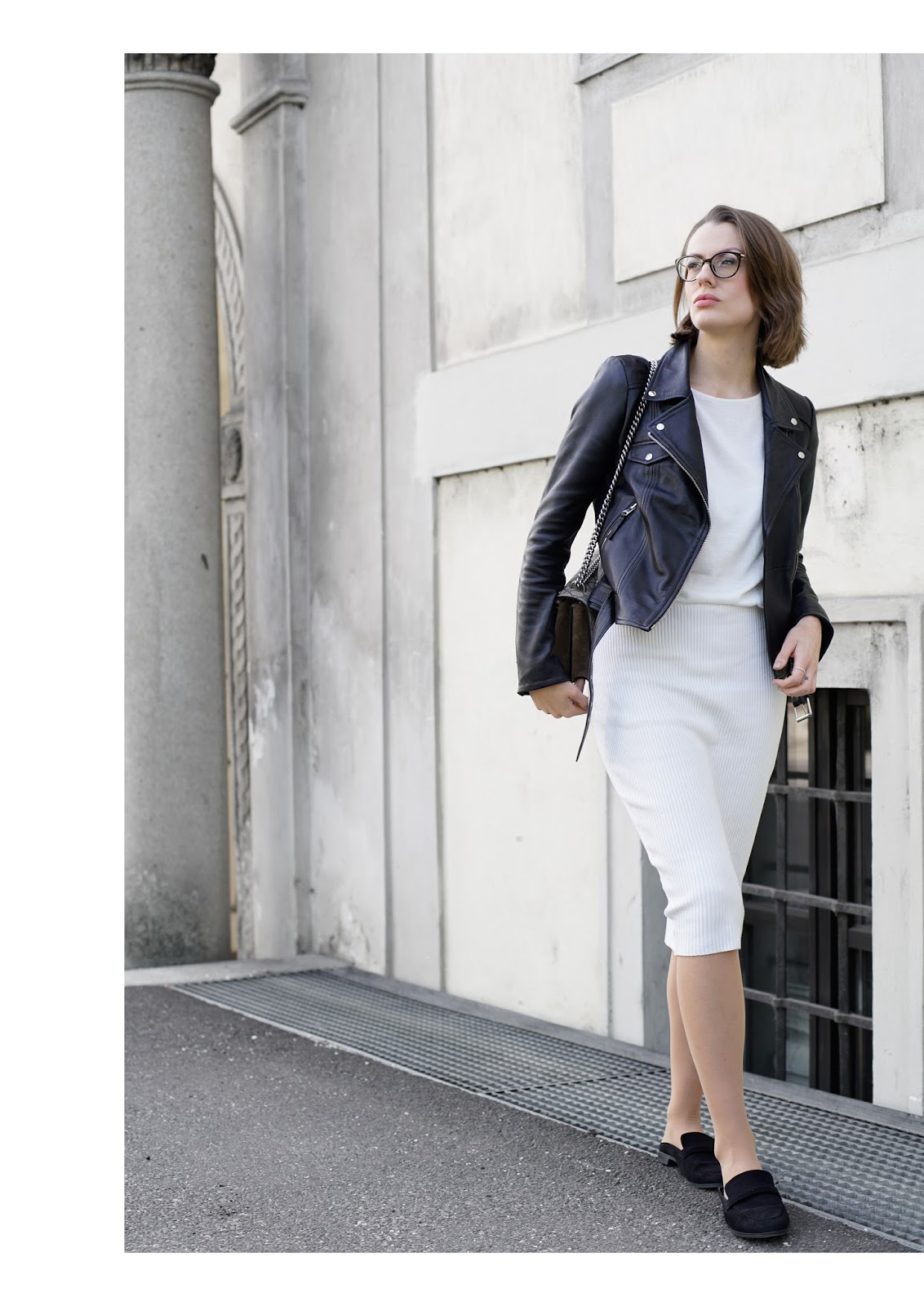 If you want to wear pencil skirts the classic way, you should go for blouses or tops and high heels. But even if you combine them with basic shirts and sneakers, the pencil skirt will add a chic twist to your look! I decided for a casual chic version this weekend and wear a H&M pencil skirt and slippers, a slightly oversized knit from ONLY, a ZARA leather jacket and my GUCCI Dionysus.
