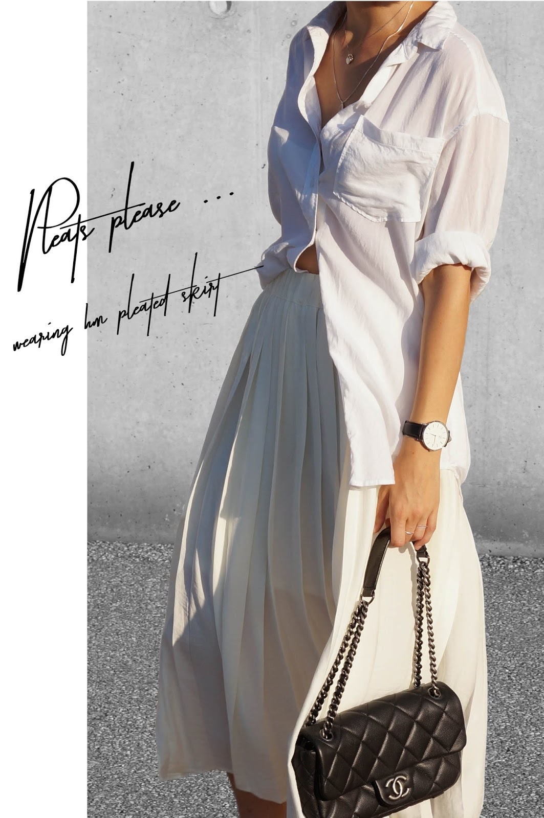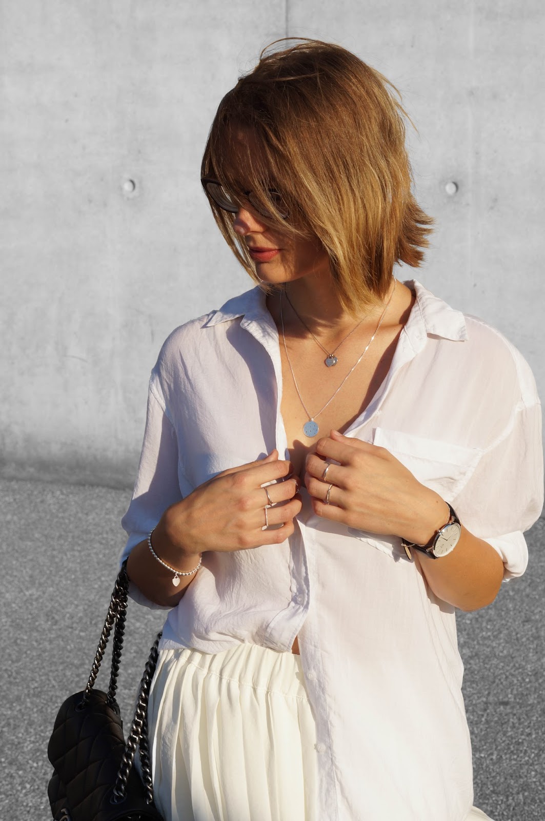 WEARING – skirt: h&m // shirt: h&m // necklaces: jukserei, tiffany&co // watch: universal time // rings: jukserei // bracelet: tiffany&co // bag: chanel // slides: h&m