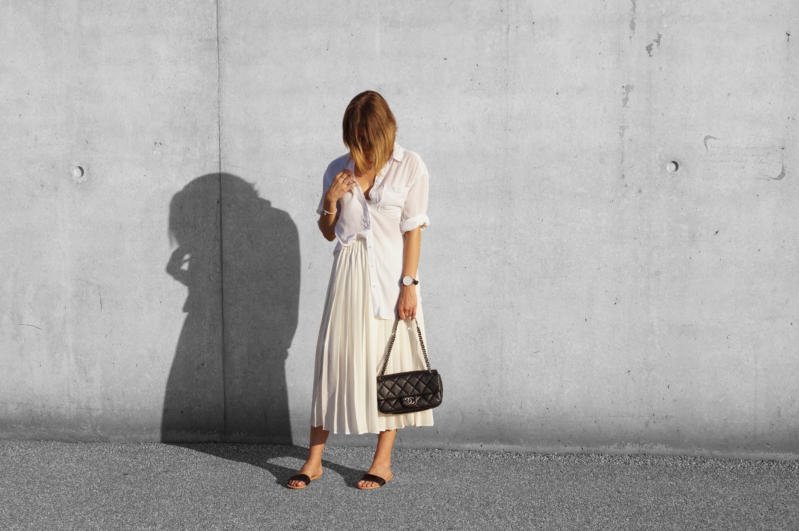 While in Scotland autumn has already arrived, today’s outfit is still an airy one (though I’m sure it is the last one for this year). And for once I am following a current autumn trend. Pleats, please! I’m totally in love with pleated skirts! Thus I got myself this beautiful h&m pleated skirt. I’m wearing an oversized h&m shirt by h&m, my beloved h&m slides and my Chanel.