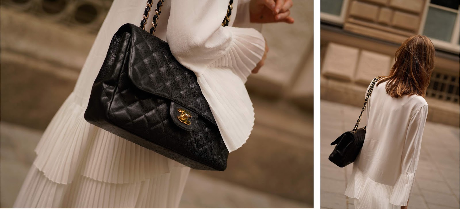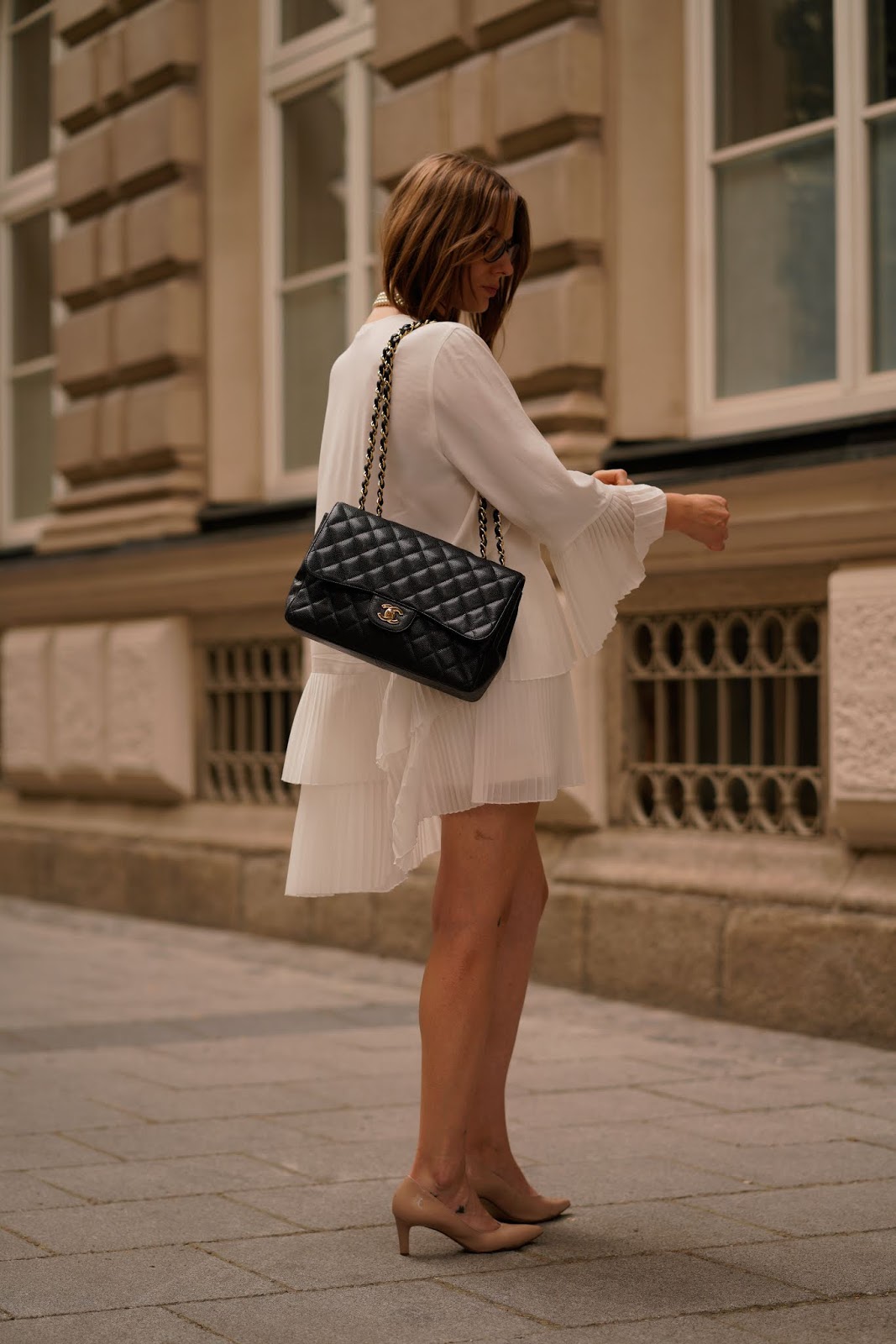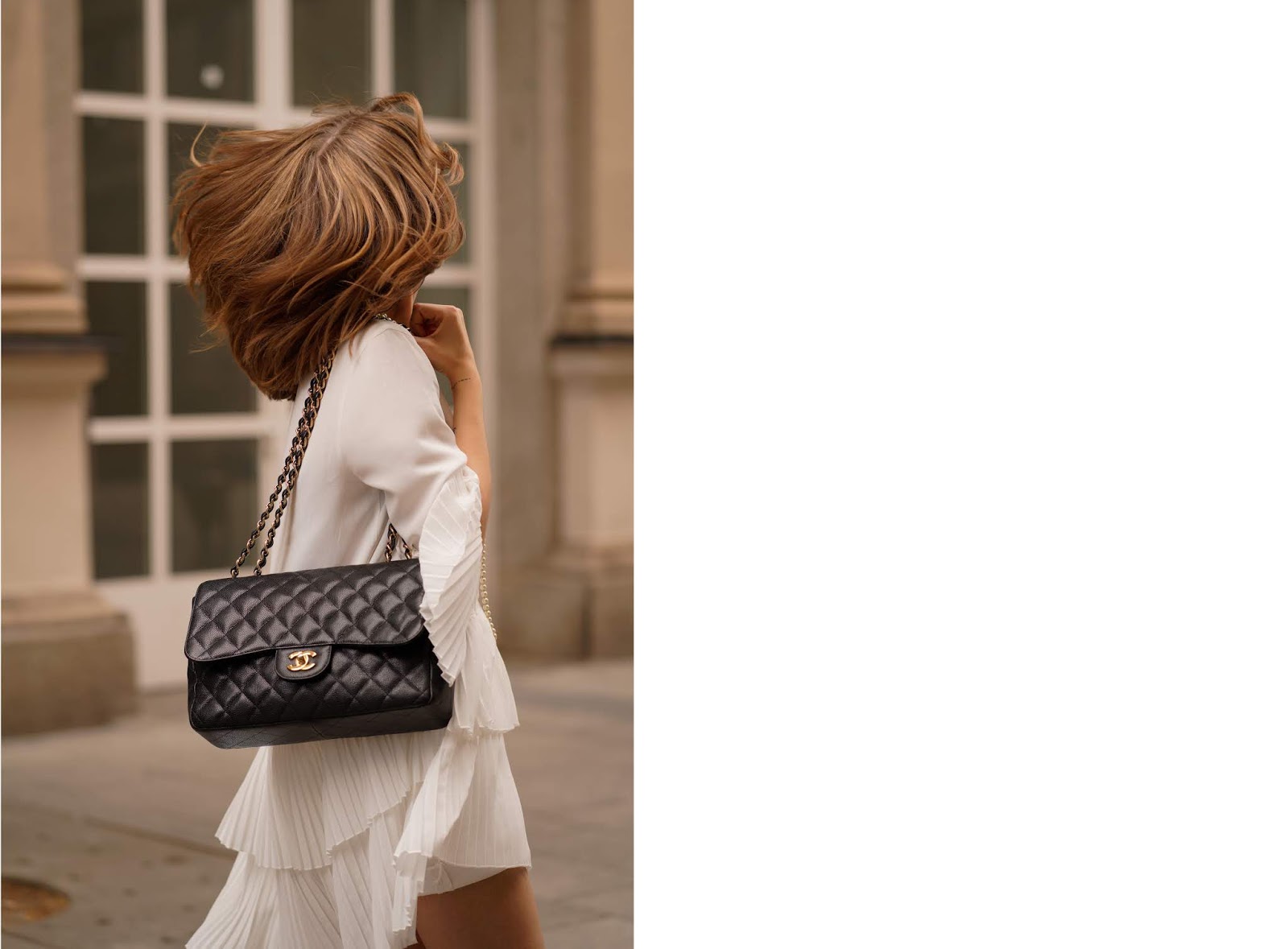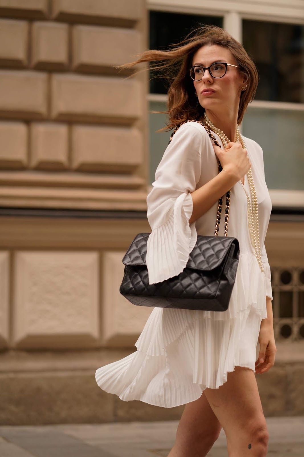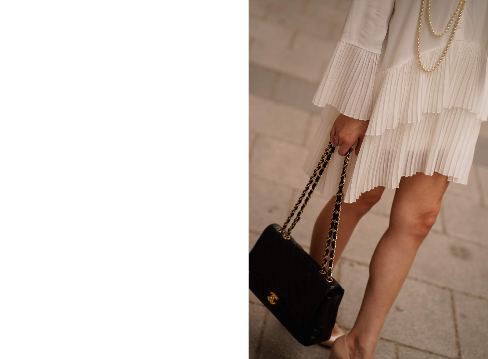 – Plissees schick stylen: Plissee ist von sich aus aber vor allen Dingen eines: tres chic! Um den Falten ihre elegante Optik zu bewahren, kombiniert sie mit Blusen, Blazern, hohen Schuhen oder Sandalen. Ich habe mich diesmal für eine besonders chice Kombi entschieden und trage mein Plisseekleid von ZARA zu Heels von HÖGL und meiner CHANEL Timeless Jumbo.