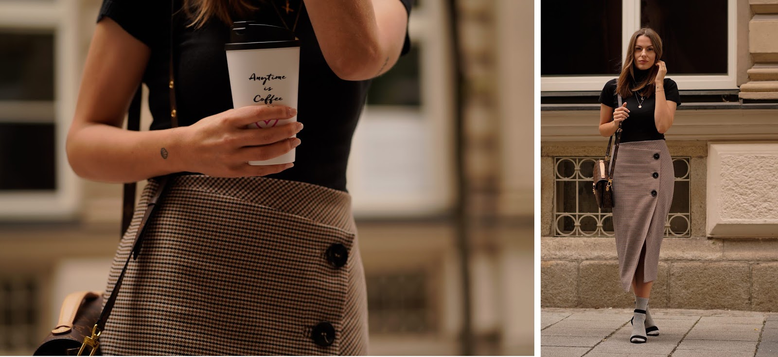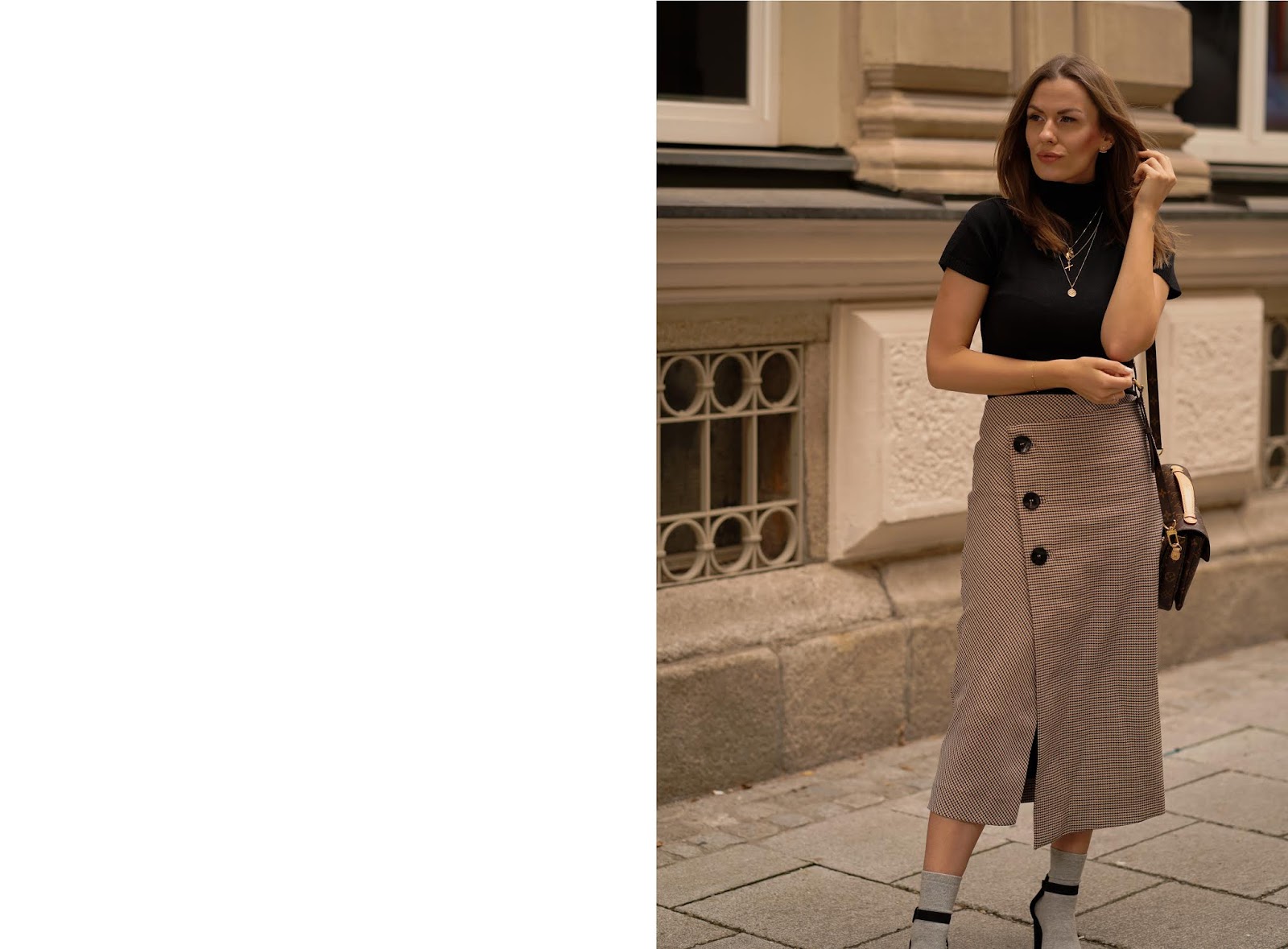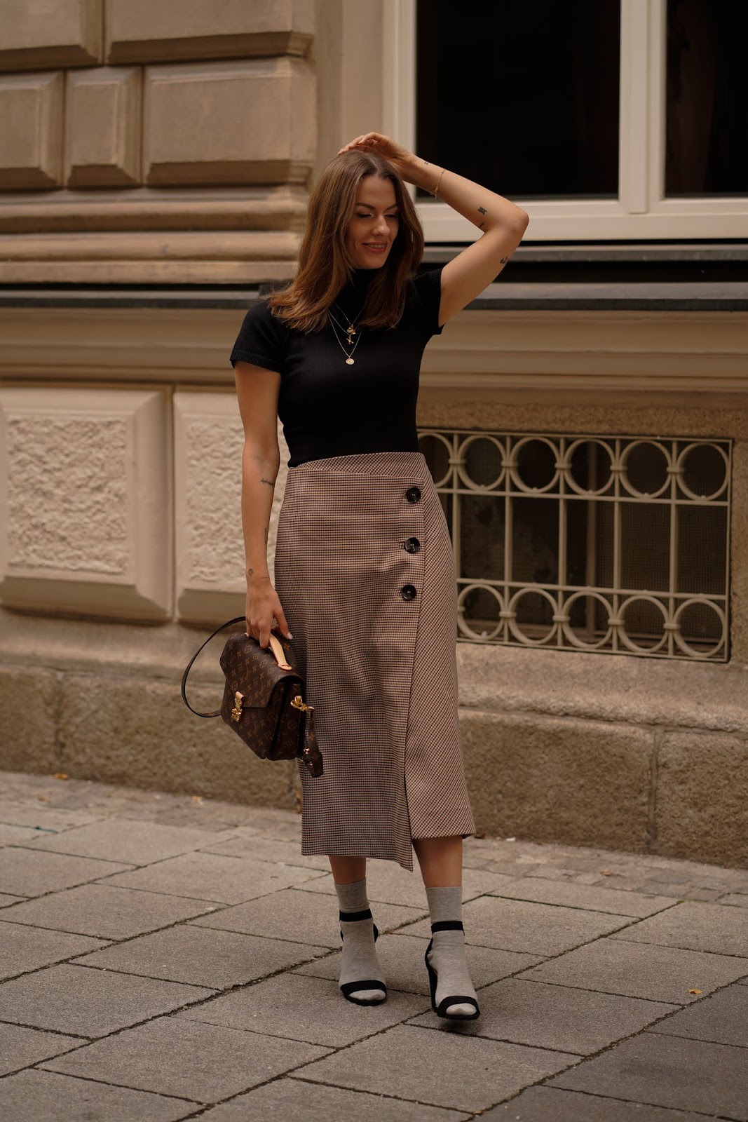 Ich habe klassische Socken in Grau gewählt und trage sie zu Sandalen, meinem liebsten Karorock und einem kurzärmeligen Rollkragenpulli. Der perfekte Officelook für den Herbst, würd ich mal sagen 😉 Wie würdet ihr den Socken Trend stylen?