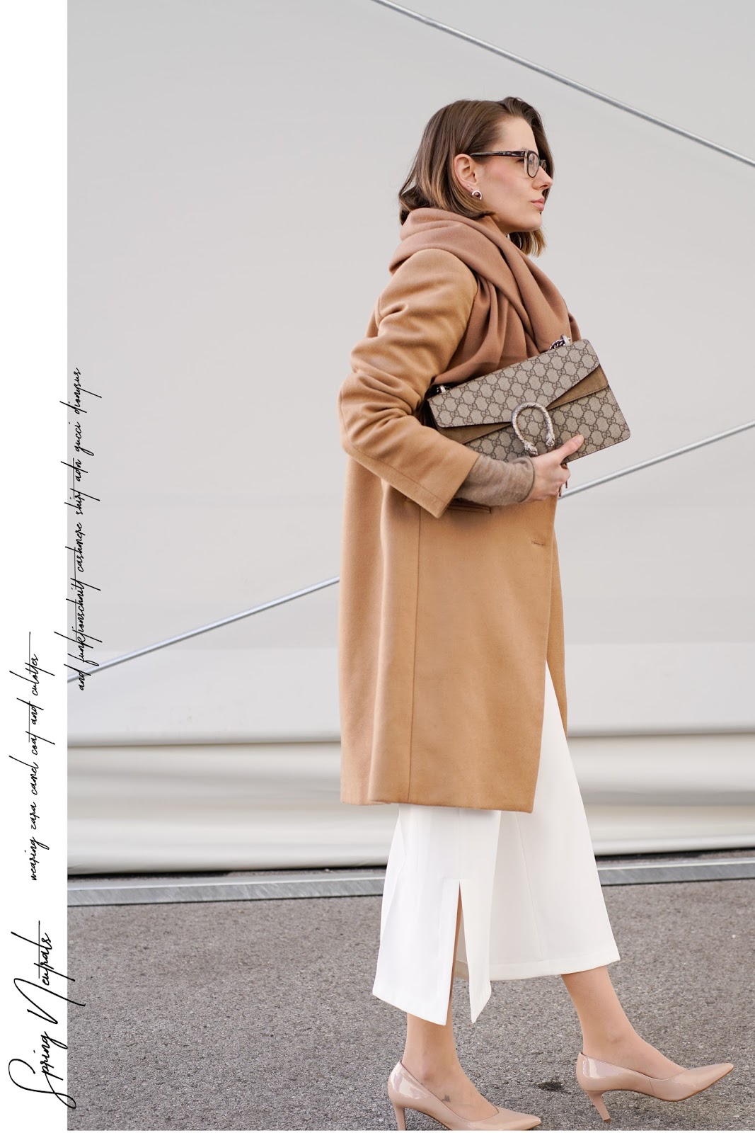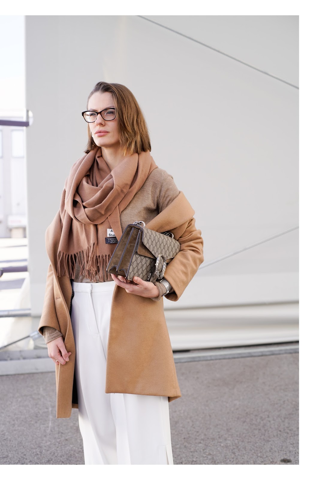 Neutrals are the new black … Oder so ähnlich;p Natürlich geht ohne Schwarz bei mir gar nichts, aber seit der Winter zu Ende geht und sich langsam die ersten Anzeichen des Frühlings bemerkbar machen, bin ich total verliebt in Neutrals, Beige, Weiß und Grau. Tatsächlich bin ich die letzten Wochen in „Spring Neutrals“ fast häufiger anzutreffen als in Schwarz … Und das will etwas heißen 😉 Passend zum warmen Wetter habe ich meine weiße Culotte (ein super Schnäppchen im Sale) mit verschiedenen Beigetönen kombiniert und konnte auch gleich noch meinen neuen Acne Schal aus Berlin ausführen, bevor es dafür zu warm wird. Und glücklicherweise passt auch meine Dionysus perfekt ins Farbschema, haha … Was sind eure liebsten Frühlingsfarben? Ich trage einen Camel Coat und Culottes von ZARA, ein Kashmirshirt von FUNKTIONSCHNITT, einen ACNE STUDIOS Schal und meine Gucci Dionysus.