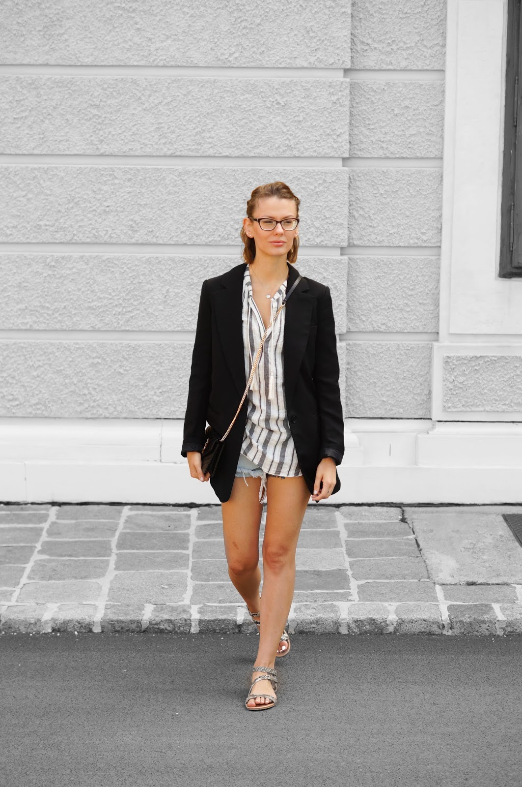 Because the weather was again very hot and summerly last week (and it shall be like this the following week as well) I thought about shooting and posting another summer uniform look (here is the other version of my summer uniform). Because who knows for how long we’ll be still able to wear shorts … For I don’t like to feel too ‘naked’, I almost exclusively wear shorts with blazers. A blazer does not only make every outfit chicer, it also makes shorts more city-suitable. What’s your summer uniform?