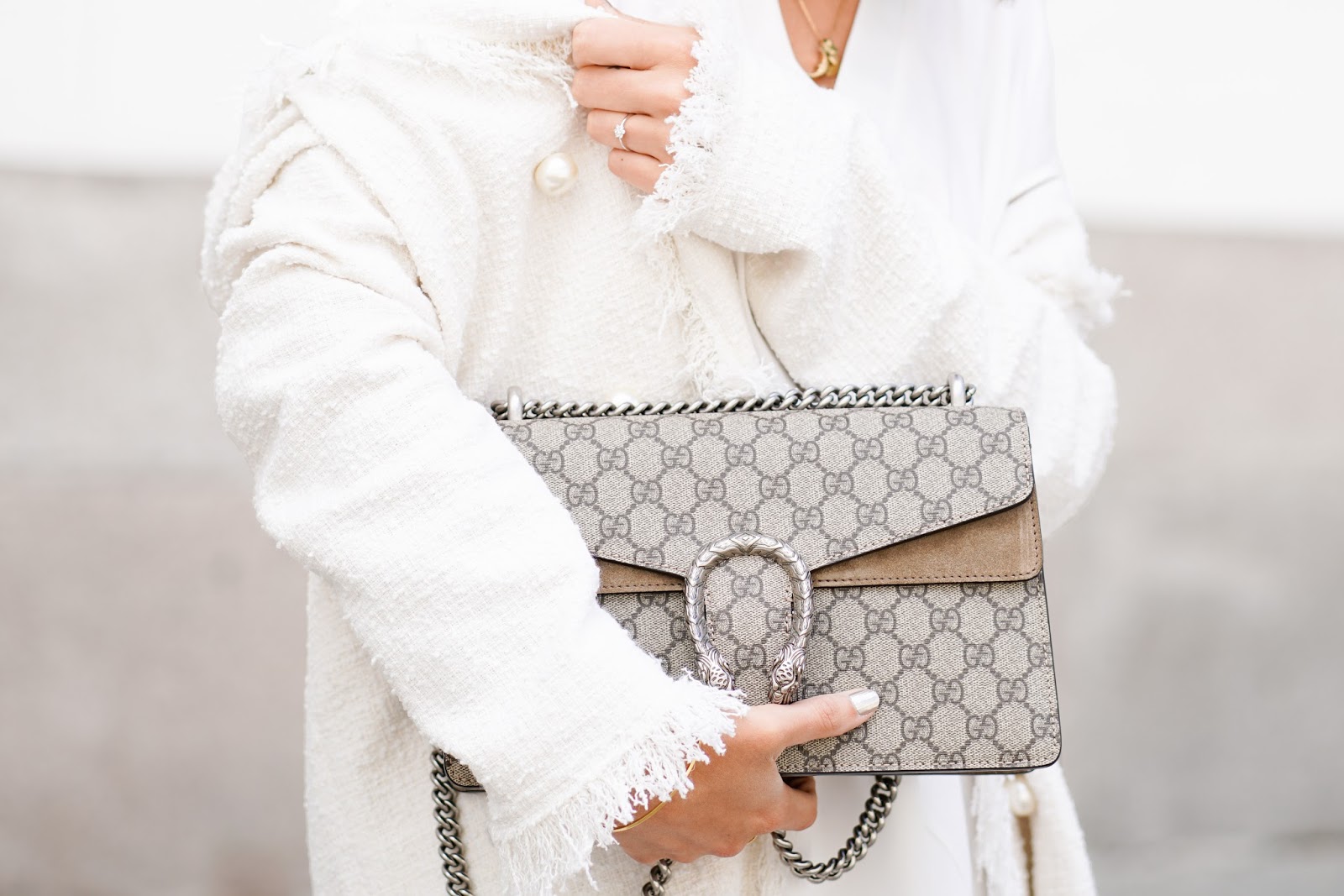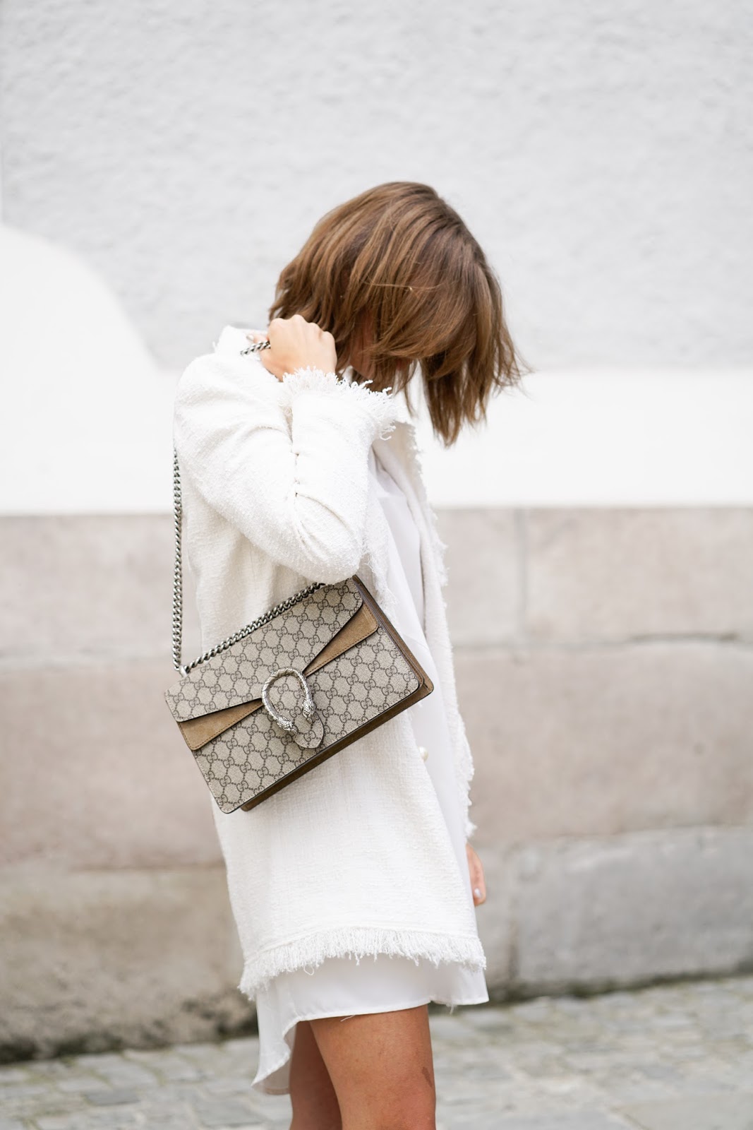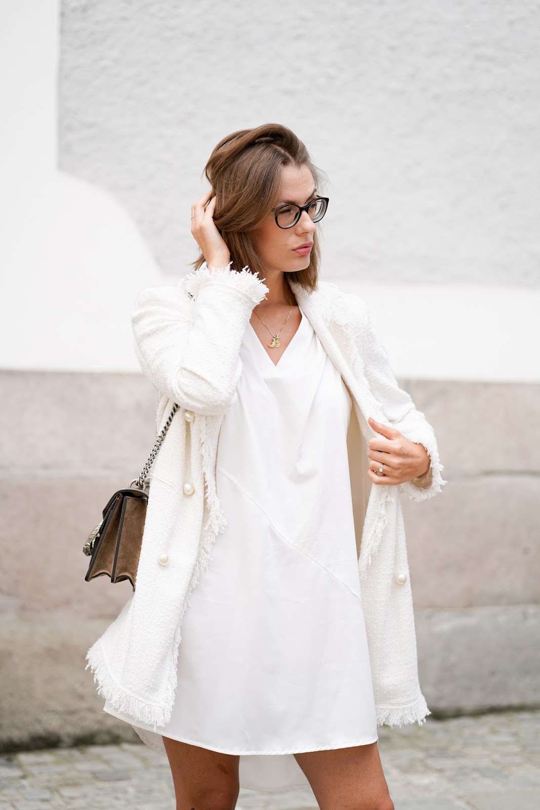Ich trage einen Boucle Blazer und ein Tunikakleid von ZARA, Bow Slippers von EDITED und meine GUCCI Dionysus.