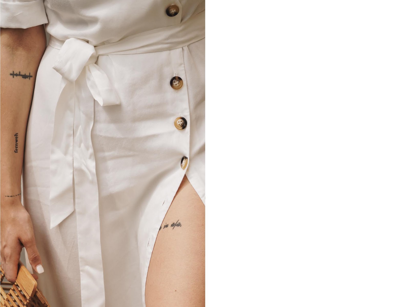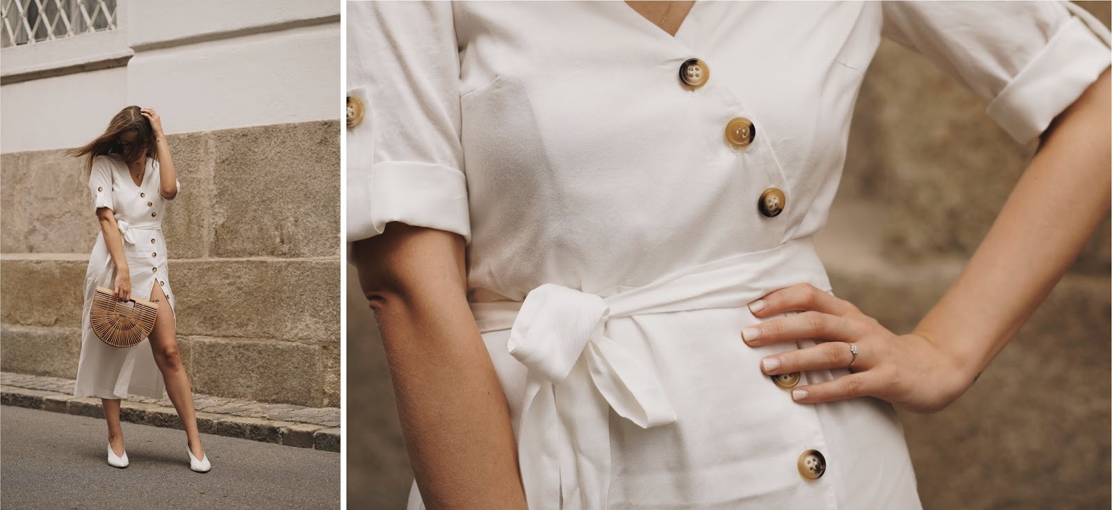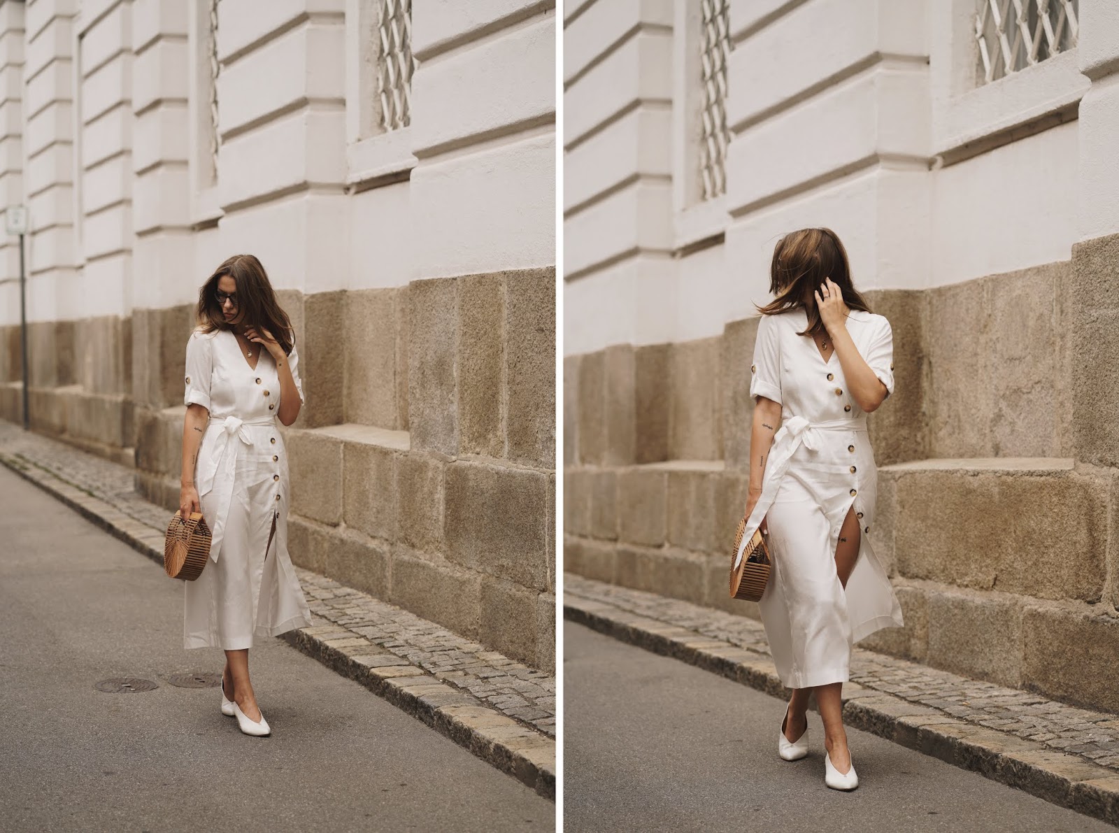 Das absolut Geniale an diesem Trend: Dank der kleinen aber feinen Knopfdetails ist gar kein großes Styling mehr notwendig! Das Kleid einfach mit Sockboots oder Heels kombinieren und fertig. Mit Sneakers lässt sich wiederum ein cooler Kontrast zum femininen Look schaffen. Eine Korb- oder Basttasche passt zu den Vintage-Vibes des Kleides und sorgt noch für einen Hauch sommerlicher Eleganz. Und mit den Knöpfen, die sich vom Kragen bis zum Saum ziehen, lässt sich auf wunderbare Weise spielen! Je nach Anlass kann man entscheiden, wie groß der Ausschnitt sein darf. Wer es lieber zugeknöpft mag, schließt die Knöpfe von oben bis unten und kombiniert das Button Down Dress zu einem Blazer oder Cardigan. So wird der klassische Look sogar Office-tauglich und man wirkt nicht zu unangezogen. Je nachdem, wie viele Knöpfe man oben und unten offen lässt, kann das Kleid aber auch auf nonchalante Weise sexy wirken. Ich trage ein Button Down Dress von ZARA, Schuhe von HALMANERA und meine CULT GAIA Ark Bag.