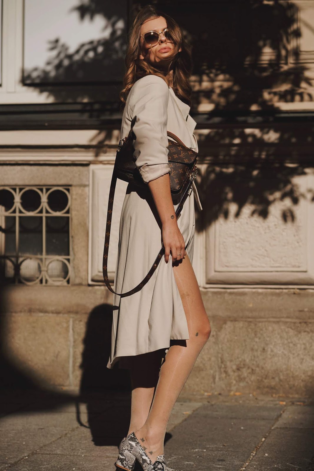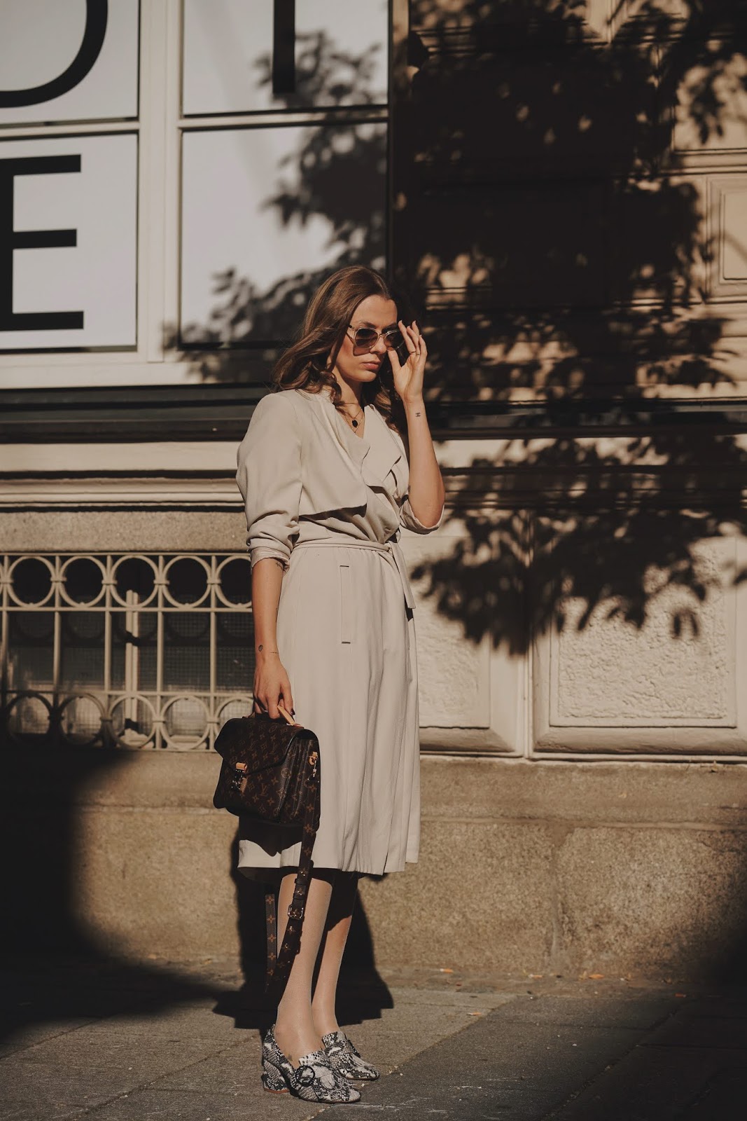 Aber wie kreativ wäre Mode, wenn man sich nicht mal über Styling-Regeln hinwegsetzt?! Ich sch*** im heutigen Post daher auf Fashion-Vorschriften und räume dem Trench Coat mal seinen ganz eigenen Platz ein. Nicht als Mantel, der einfach noch schnell darübergeworfen wird und nicht zum Aufwerten/Abrunden eines bereits bestehenden Outfits. Ich trage ihn als Kleid! Tatsächlich finde ich den Mantel einfach so genial, dass es nicht viel mehr als das Kleidungsstück selbst braucht, um als Outfit durchgehen zu können. 😉 Um dem einfarbigen Look allerdings ein wenig mehr Textur und Muster zu verleihen, habe ich meine Snakeprint Heels von MANGO und meine LOUIS VUITTON Metis dazu kombiniert. Übrigens habe ich euch vor ein paar Wochen bereits im Post SOMETIMES I DON’T WEAR PANTS: MEIN BLAZER-KLEID gezeigt, wie man auch Blazer als Kleider tragen kann 🙂