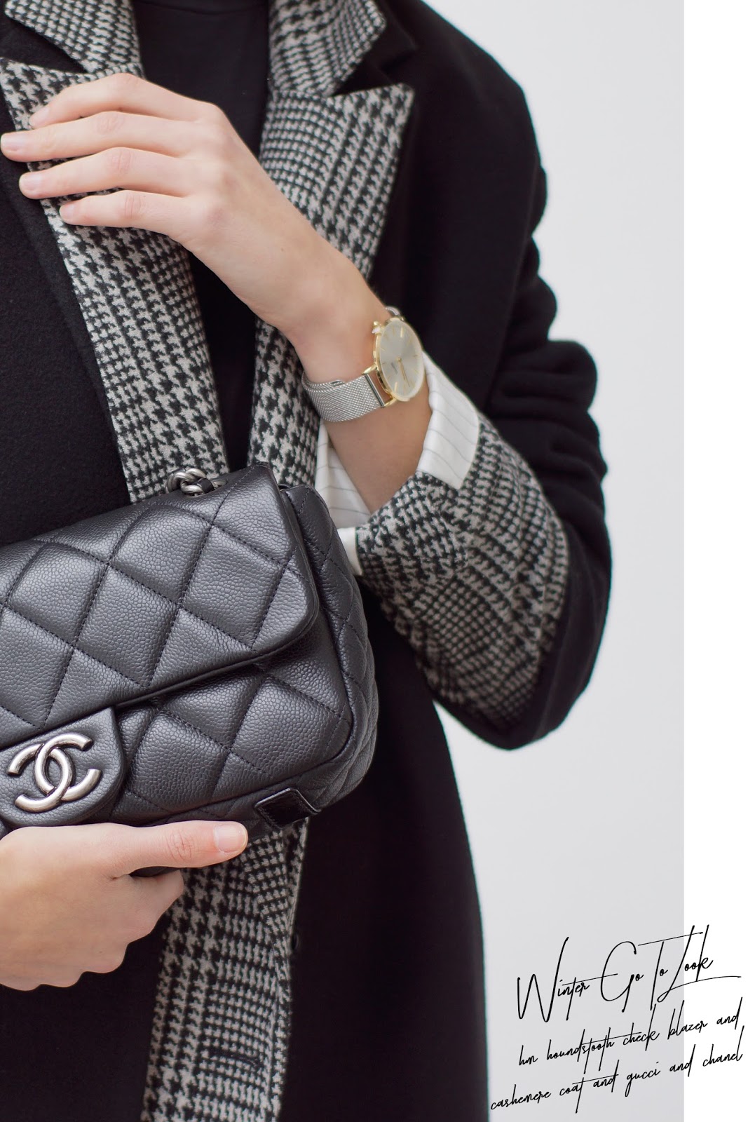 An gemütlichen Wochenenden, wenn ich nicht lange überlegen möchte, welches Outfit ich anziehen soll, greife ich gerne auf meinen Winter Go-To Look zurück. Dieser besteht zumeist aus einem warmen Shirt oder Pulli, Blazer und Mantel. Momentan sind das fast immer mein Houndstooth Check Blazer von H&M Trend und mein neuer Kaschmirmantel von H&M Premium. Ich fühle mich darin wohl und das Beste ist, mein Go-To Look passt zu fast allen Unternehmungen, egal ob legerer Lunch, Kinodate oder Shoppingtrip. Meist setze ich noch einen Akzent mit einem wärmenden Schal, einer schönen Tasche oder einem Statement Gürtel. Ich trage ein Merino Shirt von FUNKTIONSCHNITT, einen Houndstooth Check Blazer von H&M TREND und einen Kaschmirmantel von H&M PREMIUM, eine ZARA Hose, DEICHMANN Boots, einen GUCCI Gürtel und meine CHANEL.
