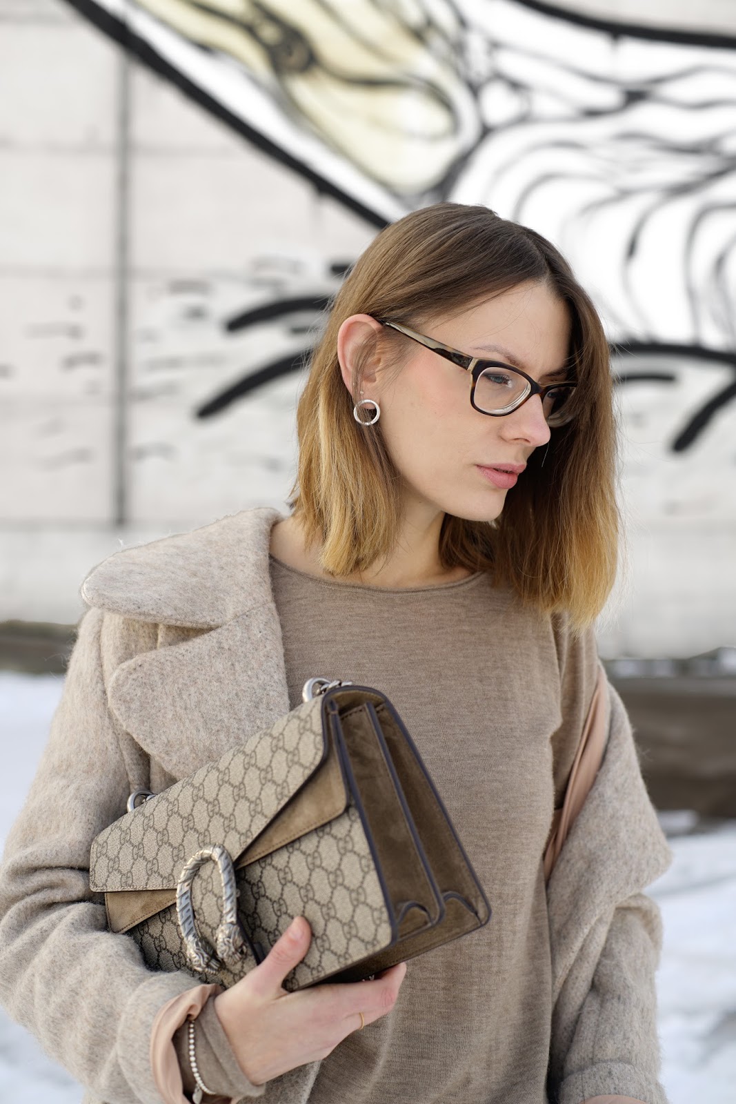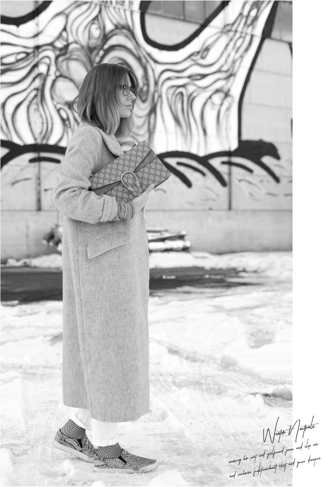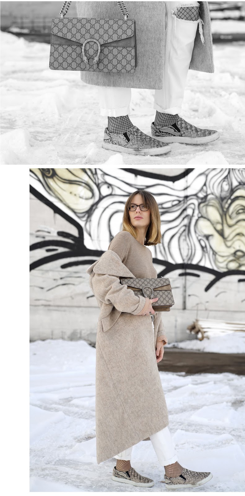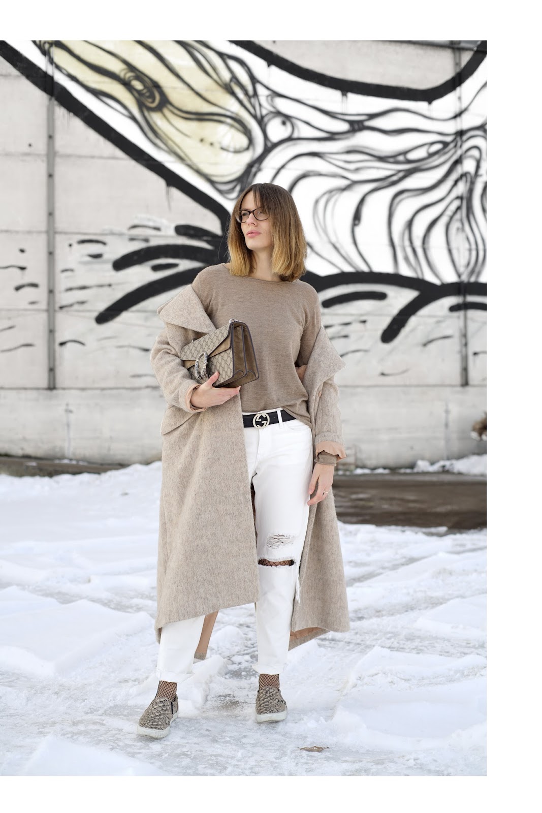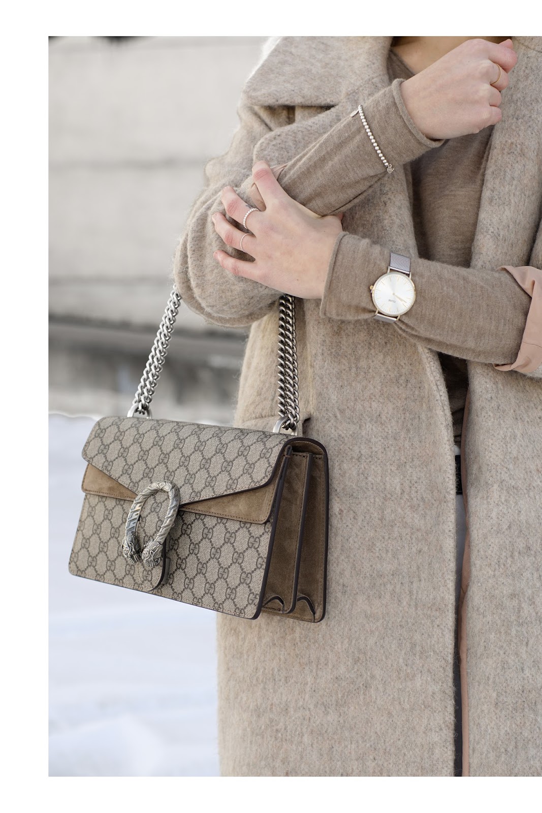For there was hardly any day the last few weeks Peter and I haven’t been on the run, on weekends I sometimes prefer to wear a really comfy weekend look. Most of the time, they’re not very chic, but with the right accessories I really try to keep them stylish. So I tried to compose an outfit in winter neutrals around my new Gucci Dionysus. For it almost felt like spring on the weekend with sunshine and plus degrees and I’m already tired of winter, I changed my dark color palette to winter neutrals. I love light colors, even in winter, especially when it’s about „fighting“ the long lasting cold and drabness. I wear a H&M PREMIUM wool coat, a FUNKTIONSCHNITT cashmere shirt, a H&M girlfriend jeans, a GUCCI belt, H&M fishnet tights and slip ons and my GUCCI DIONYSUS.