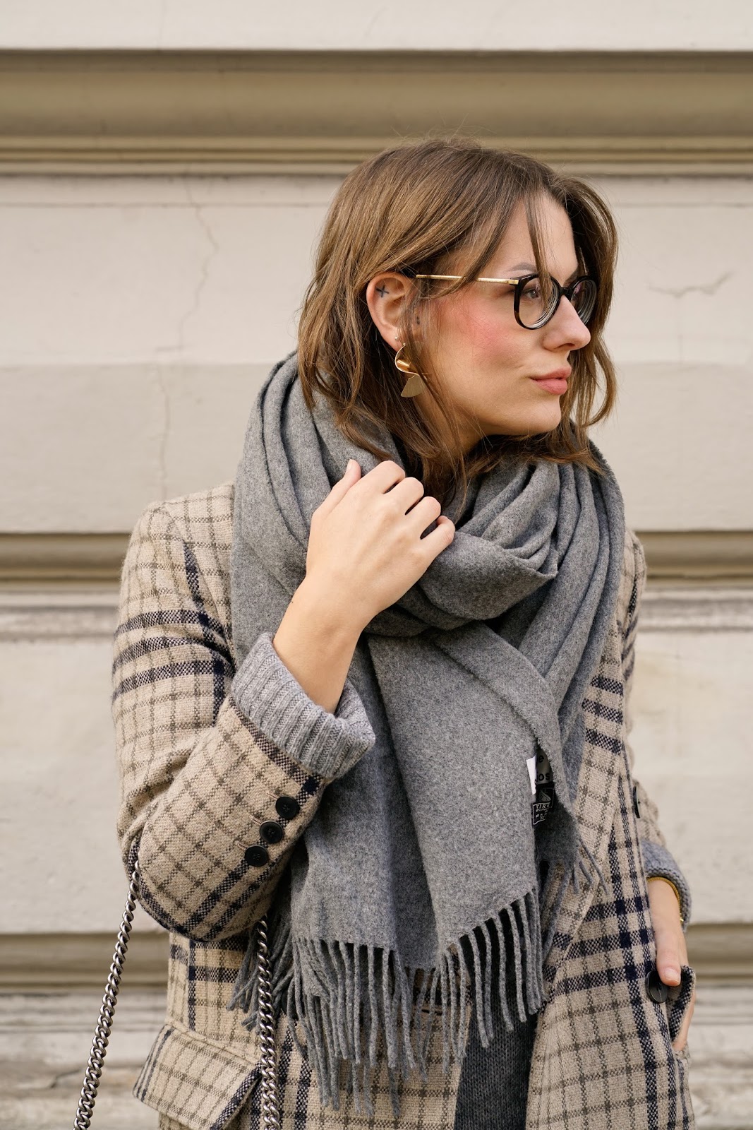 Ich hab mich diesmal für den größten XL-Pulli in meinem Schrank entschieden, den ich gerne mal als Kleid trage. Dazu Overknees, Wintermantel und einen dicken Schal, damit es auch bei den fallenden Temperaturen nicht zu kalt wird. Auf Schmuck hab ich, abgesehen von meinen Statement Ohrringen, verzichtet. Ich trage einen Oversize Pulli von H&M, Overknees von ZARA, einen Checkered Coat von MANGO, meinen ACNE Scarf und meine GUCCI Dionysus.